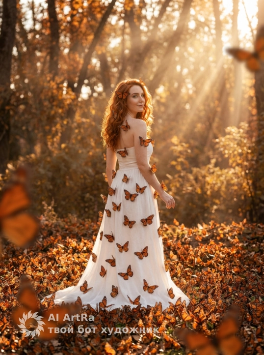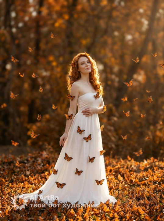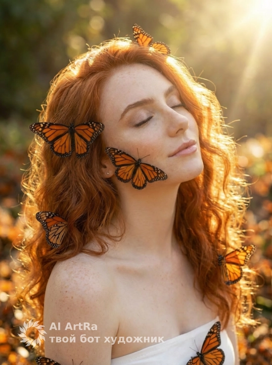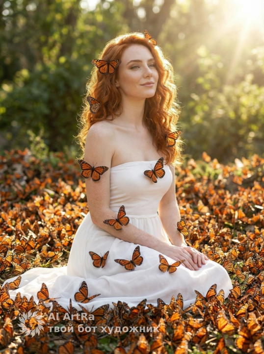Изящная женщина грациозно сидит в море гиперреалистичных бабочек-монархов, покрывающих землю. Бабочки покоятся на ее волосах, руках и белом платье-бандо без рукавов. Сказочная, мечтательная атмосфера, неземным сиянием, спокойным, похожим на сон настроением. Яркое солнце, яркие краски бабочек. Нежное, безмятежное, мечтательное выражение лица. Тонкий, но выразительный макияж. кинематографическое освещение, сильная детализация бабочек.