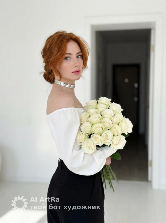 A photorealistic portrait of a woman holding a large bouquet of white roses, medium shot, with her body turned sideways to the camera and her head slightly tilted toward the camera. Her hair is styled in a low, loose bun with voluminous strands near her face. The woman wears light makeup, an even matte skin tone, pink lips, and mascara. She is dressed in a white off-the-shoulder top with puffy long sleeves and black, high-waisted pants. She wears a shiny silver choker and holds a dense bouquet of fresh white roses. The scene takes place in a bright, minimalist room with white walls and soft shadows. The darkened hallway interior is visible through the open door. Soft, diffused daylight from the window creates light shadows without harsh contrast. Shot with an 85mm portrait lens; the background is blurred with soft bokeh.