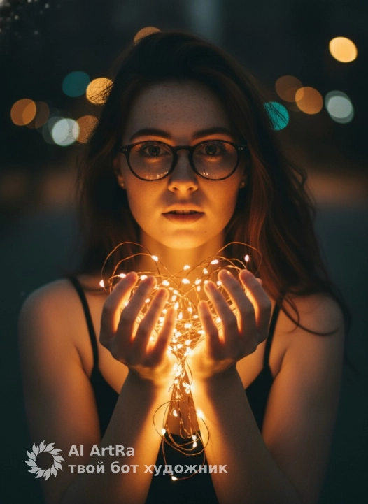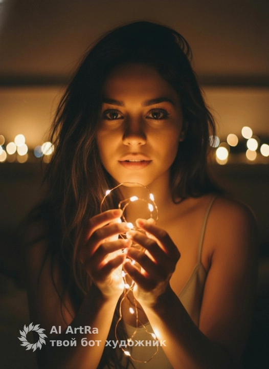 Не меняя внешности женщины с фото, девушка изображена крупным планом в тёплом вечернем освещении, источником которого служат многочисленные яркие огоньки гирлянды, которую она держит руками вблизи лица. Её взгляд направлен прямо в камеру, выражая лёгкое удивление или задумчивость, а глаза отражают мягкий свет, создавая ощущение живости и глубины. Волосы женщины длинные, слегка растрёпанные, тёмные, они не распрямлены, но и не запутаны — их текстура слегка размылась на фоне бликов, подчёркивая интимность момента. Кожа её лица и плеч подсвечена теплым жёлто-оранжевым светом, отбрасывающим мягкие тени, которые подчёркивают контуры черт лица и плавные линии тела. Видна верхняя часть тела, плечи обнажены, но деталей одежды почти не различимо из-за освещения и положения девушки, кажется, что она в чём-то лёгком и тёмном, возможно, на тонких бретелях, но это нельзя определить однозначно. Фон вокруг расплывчатый, сильно затемнённый, с боков и вдалеке виднеется боке разноцветных светящихся точек, создающих атмосферу уюта и волшебства, напоминающую праздничный вечер. Свет от гирлянды, который девушка аккуратно удерживает пальцами, оживляет композицию, добавляя живое мерцание и подчёркивая интимность сцены, при этом всё помещение или детали интерьера неразличимы и скрыты тенью. Атмосфера снимка теплая, мягкая, с использованием глубоких тёплых тонов и художественной игры света и тени, словно картина с кинематографическим фокусом на эмоции и световую игру, создающую атмосферу сказочного уединения, фотореалистичное изображение, высокая текстурная детализация, высокое качество, разрешение 4K.