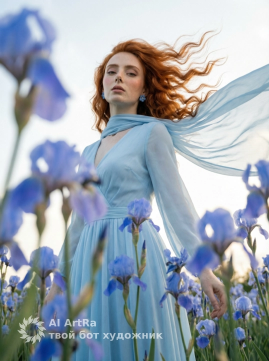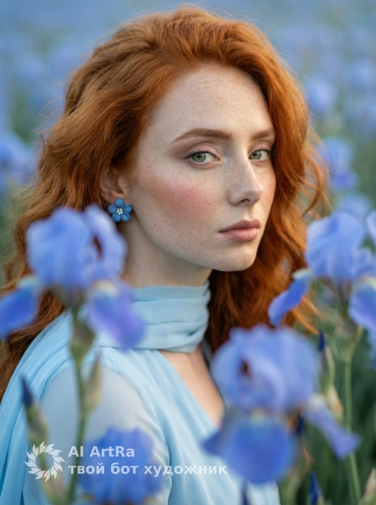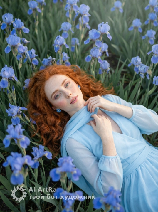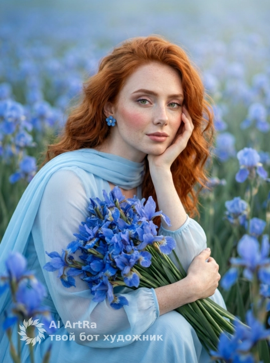 Используйте внешний вид пользователя, референса 1:1 — лицо, кожу, волосы и тело без каких-либо изменений. На изображении — женщина в позе полусидя, слегка наклонившаяся вперёд, опираясь левой рукой о щёку, правой обнимая пышный букет синих ирисов; её взгляд мягкий, задумчивый, с лёгкой улыбкой, макияж естественный — подчёркнуты брови, тени на веках в пастельных тонах, румяна на скулах, губы с матовым блеском; ногти короткие, аккуратно подпилены, без лака; на ушах — синие серьги-гвоздики в форме цветка; одета в воздушное платье нежно-голубого цвета с прозрачными рукавами и шарфом того же оттенка, плавно драпирующимся на плечах; фон — бескрайнее поле синих ирисов, размытое на заднем плане, создающее эффект глубины; освещение мягкое, рассеянное, как в пасмурный день, с лёгким золотистым оттенком, подчёркивающим атмосферу спокойствия и романтичности; стиль — фотореализм с лёгкой художественной обработкой, камера на уровне глаз, ракурс слегка снизу, кадр средний, фокус на лице и букете, передающий настроение умиротворения и гармонии с природой.