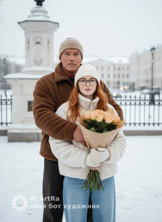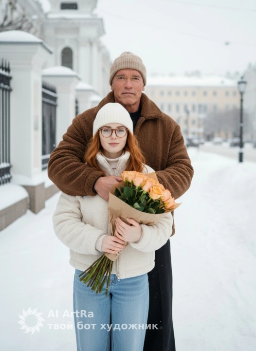 This prompt must be applied to the people in the photo. Important: Do not change or distort faces. Do not alter facial expressions. Faces must be preserved completely, as in the original photos. Use the facial features and likeness from the provided reference images. Generate the scene around them, but keep their faces identical. Prompt: A medium close-up portrait of a couple embracing outdoors, with the woman holding a bouquet of peach roses, captured against the backdrop of a snowy Russian city. The woman is wearing a creamy white plush fleece jacket and a white knit beanie, light blue wide-leg jeans, and is holding a bouquet of soft peach roses wrapped in craft paper. The man is dressed in a thick, warm brown plush fleece jacket and a neutral beige knit beanie, dark wide-leg trousers, and is hugging the woman from behind. Both are looking at the camera. The street is a historic urban setting in winter, with the ground covered in snow. In the background is a white architectural feature and a dark metal fence, against a backdrop of blurred white stone buildings in the distance. Soft, diffused daylight, typical of a bright but overcast winter day. The lighting is even, with subdued . Shot with an 85mm portrait lens, shallow depth of field, the couple is in sharp focus and the background is slightly blurred, high resolution, photorealistic.