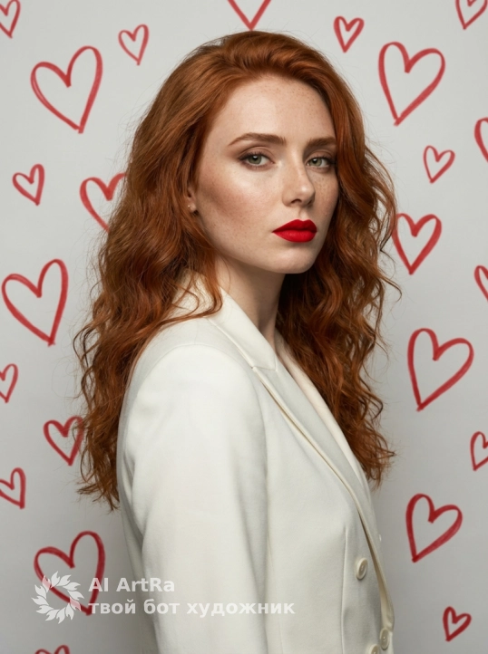 Портрет молодой девушки в профиль на светло-сером фоне с нарисованными красными сердцами. Она стоит вполоборота вправо, её корпус развернут на три четверти, голова слегка наклонена к правому плечу, взгляд направлен прямо в камеру. Губы плотно сомкнуты, накрашены матовой помадой насыщенного алого цвета (#FF0000), выражение лица спокойное, задумчивое. Кожа имеет бархатистую, матовую текстуру с легким естественным сиянием на скулах и переносице. волосы уложены крупными волнами, спадают на спину и левое плечо; отдельные пряди имеют четкую структуру и легкий блеск. Девушка одета в приталенный двубортный жакет молочно-белого цвета (#F5F5F1) из плотной костюмной ткани с выраженной мелкой фактурой переплетения нитей. На жакете виден острый лацкан и прорезной карман с клапаном внизу. Обеими руками, согнутыми в локтях перед собой, она держит пучок из тонких красных атласных лент, уходящих вверх к связке из пяти крупных глянцевых воздушных шаров в форме сердец насыщенного кроваво-красного цвета. Шары имеют четкие белые блики от студийного софтбокса, подчеркивающие их гладкую латексную поверхность. Фон украшен множеством графичных сердец разного размера, нарисованных небрежными мазками красного маркера. Освещение мягкое, фронтально-боковое, создающее плавный градиент теней на одежде и лице. Постобработка включает деликатную ретушь, высокую четкость деталей и чистую цветокоррекцию с акцентом на контраст белого и красного. Глубина резкости средняя: модель и шары в фокусе, фон слегка смягчен.