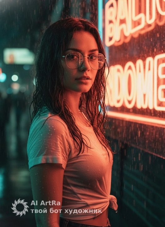 Не меняя внешности женщины с фото, атмосферный кадр захватывает её в момент под интенсивным дождём перед ярко неоновым рекламным панно, мягко размытым в глубине сцены, создающим пульсирующую, кинематографическую ауру. Девушка повернута корпусом вправо, при этом её взгляд устремлён прямо на зрителя, что придаёт образу интригующую напряжённость и внутренний фокус. Её короткие, мокрые волосы струятся свободными, слегка спутанными прядями, обрамляя влажное лицо, на котором чётко видны капли дождя, стекающие по коже, подчёркивая естественную текстуру и влажное сияние. Она носит большие, тонкие, металлические очки с большими круглыми линзами, на которых тоже слои воды, что добавляет глубину взгляду и лёгкую интригу. Верхняя часть её одежды — тонкая, светлая футболка с короткими рукавами, плотно прилегающая к телу благодаря насыщенной влаге, покрытая множеством капель, которые играют светом, создавая почти перламутровый эффект. Футболка связана узлом спереди, что подчёркивает талию и добавляет небрежный, но выразительный элемент образу. Освещение сцены многослойное: с одной стороны льётся холодный зелёно-голубой свет, подчёркивающий контуры плеча и темноватые тени, а с другой стороны — тёплый насыщенный красный и оранжевый свет из неона мягко окутывает правую сторону тела и лица, создавая контраст и объём. Задний план сглажен, с неразличимыми формами букв и световых пятен, которые придают сцене глубину и ощущение городской ночи. Вся композиция наполнена чувством сосредоточенного спокойствия и лёгкой загадочности, одновременно подчёркивая изящество и естественную красоту девушки, сохраняя её индивидуальные черты с невероятной точностью. Влажность и световая игра создают ощущение интимности и кинематографической эстетики, словно это заметка в дневнике дождливой ночи большого города, фотореалистичное изображение, высокая текстурная детализация, высокое качество, разрешение 4K.