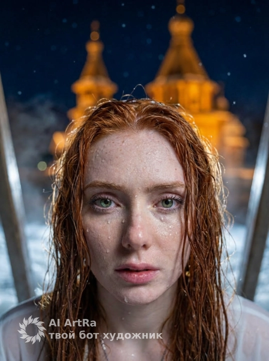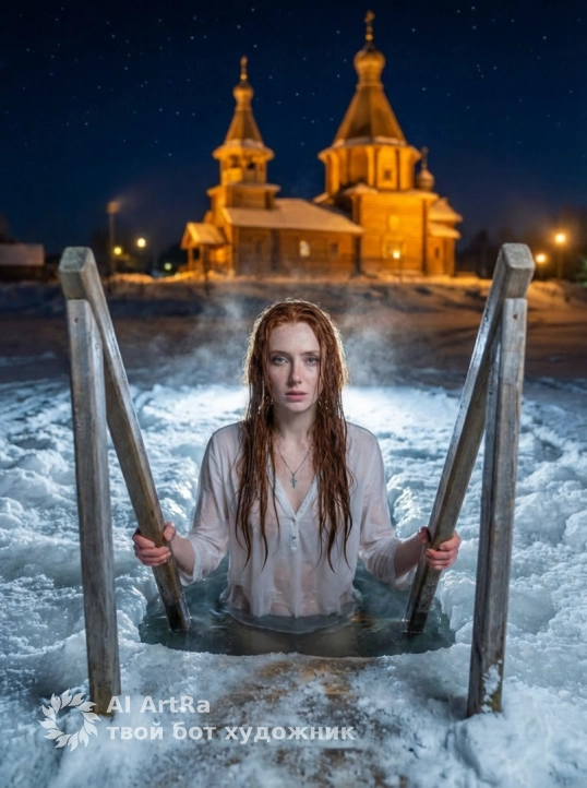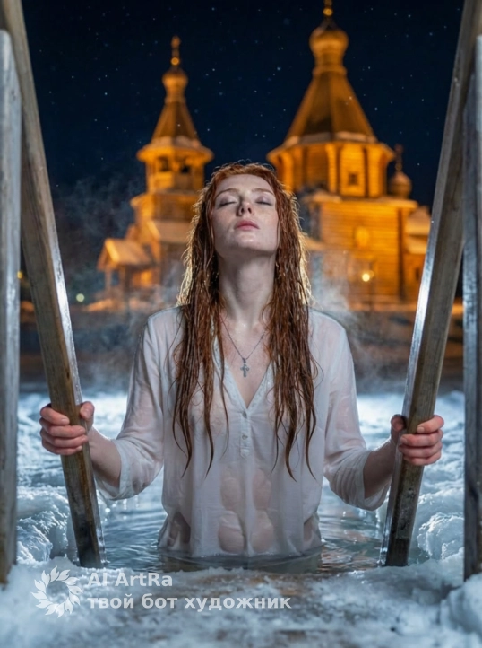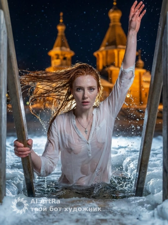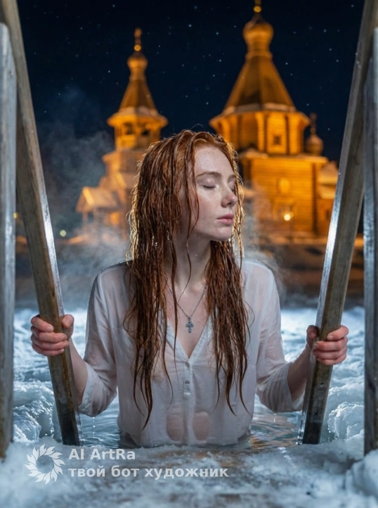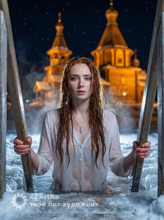 Фотореалистичный портрет женщины в проруби ночью у деревянного православного храма с золотыми луковичными куполами. Вертикальная композиция, кадр по пояс — женщина держится обеими руками за деревянные поручни лестницы, выглядывающей из ледяной проруби. Влажные волосы, белая сорочка полностью промокшая и слегка прилипшая к телу, на шее крест на цепочке. Из проруби поднимается пар/дым, вокруг лёд и свежевыпавший снег, на заднем плане тёпло освещённый деревянный храм с подсветкой, ночное небо усыпано звёздами. Атмосфера контраста: холодный синий тон льда и воды + тёплый золотистый свет храма на заднем плане; драматичное, кинематографичное освещение с сильной окантовкой (rim light) на волосах и плечах. Чёткая детализированная текстура льда, капли воды на волосах и сорочке, видна лёгкая паровая дымка над водой. Сильная глубина резкости — резкость на руках и верхней части тела, мягкое боке на фоне храма и звёзд. Настроение — мистическое, торжественное, холодный воздух