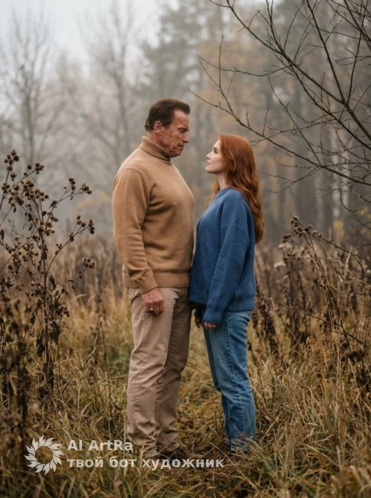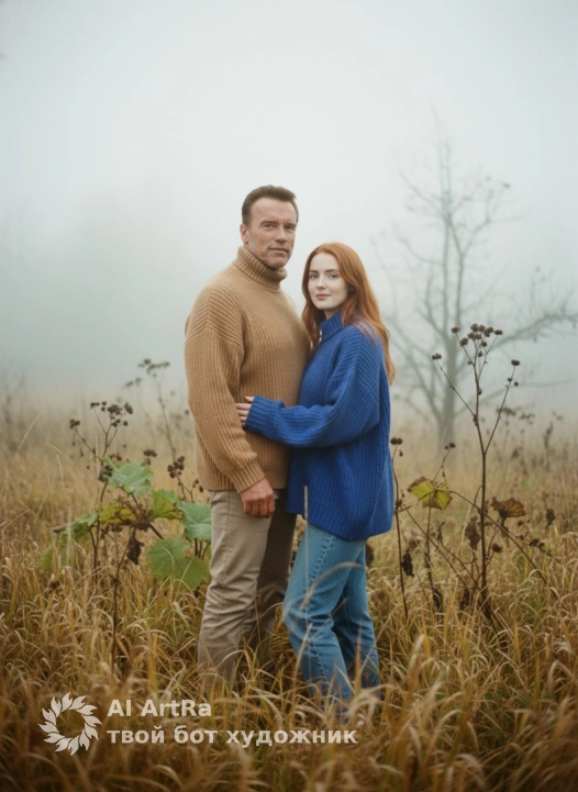 family portrait, they stands sideways in an autumn field. he wears a camel oversize turtleneck sweater and nude color jeans. she wears blue oversize sweater and blue jeans. The scene is a knee-length portrait shot from a low angle, surrounded by tall dry grass, burdock, and bare tree branches in a foggy forest clearing. Soft, overcast daylight creates even lighting with minimal shadows and a smoky atmosphere. Photorealistic style, highly detailed skin texture, 85mm lens, shallow depth of field, creamy bokeh, slight film grain, muted earthy colors