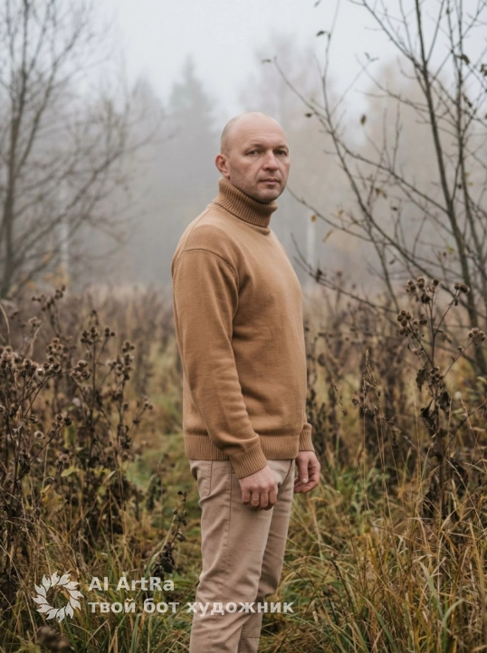 A man portrait, he stands sideways in an autumn field, him head turned to the camera with a neutral expression. wears a camel oversize turtleneck sweater and nude color jeans. The scene is a knee-length portrait shot from a low angle, surrounded by tall dry grass, burdock, and bare tree branches in a foggy forest clearing. Soft, overcast daylight creates even lighting with minimal shadows and a smoky atmosphere. Photorealistic style, highly detailed skin texture, 85mm lens, shallow depth of field, creamy bokeh, slight film grain, muted earthy colors