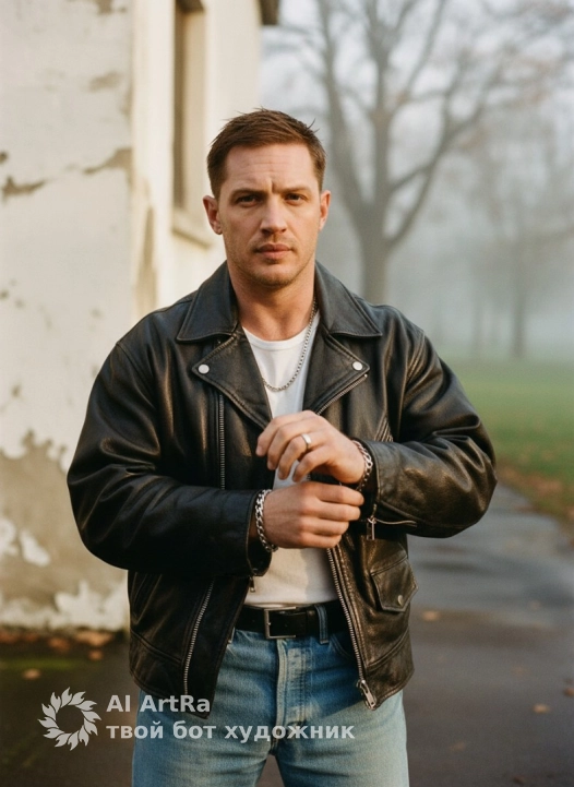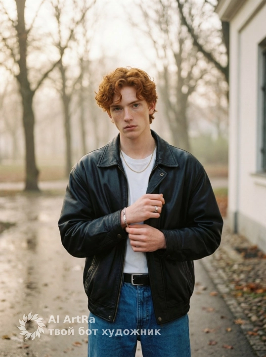 Portrait of a man adjusting his bracelet with his hands, medium shot, eye-level perspective, looking at the camera, dynamic position, wearing an oversized black leather jacket, a white T-shirt, high-waisted blue jeans, a black belt, a silver chain, a silver bracelet, and a silver ring. Part of the white wall of a building is in the background. A park with bare trees, soft daylight with side lighting, soft shadows, a warm and cozy atmosphere of late autumn after the rain, foggy. Shot with a 50mm portrait lens, shallow depth of field, background with a bokeh effect, film-style photography with fine grain, earthy color palette with autumn tones, high detail, photorealism.