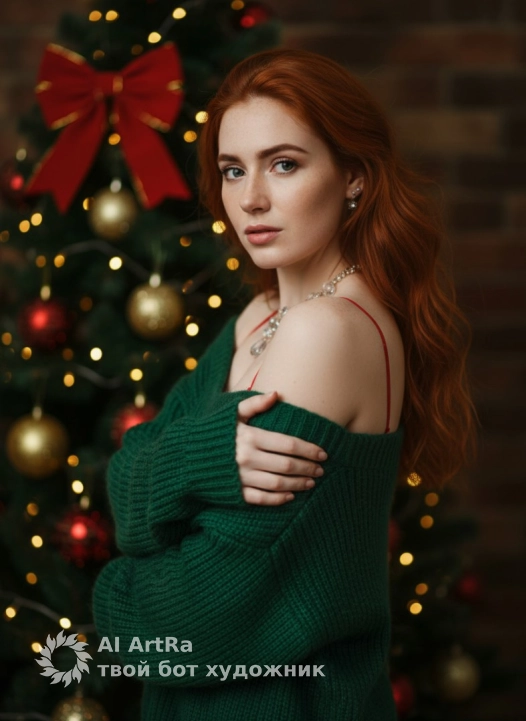 Не меняя внешности женщины с фото, перед нами предстает сценическая и изысканная композиция, наполненная атмосферой праздничного уюта и тепла. Женщина позирует в полупрофиль, слегка развернув корпус и уверенно глядя прямо в камеру, что добавляет кадру интенсивности и внутренней силы. Ее волосы аккуратно уложенные, контрастируют с мягким светом, который упирается в лицо, подчеркивая гладкость кожи и тонкие черты. Широкий зеленый свитер из плотной вязки неряшливо ниспадает с плеч, обнажая красные бретели более легкой ткани – них можно различить тонкую текстуру, свидетельствующую о ее воздушности. Руки женщины сведены перед собой, сдержанно обнимая себя, что создает ощущение интимности и легкой задумчивости. Ногти аккуратно покрыты светлым лаком, на пальцах отсутствуют украшения, что не отвлекает внимание от остальных деталей образа. На шее и в ушах сверкают изящные украшения с полупрозрачными камнями, которые деликатно отражают источники света, наполняющие общую картину блеском. За спиной раскинулся елочный фон, насыщенный темно-зелеными иголками и яркими праздничными аксессуарами – большим красным бантом, елочными шарами и мягкими золотыми огоньками, размытие которых создает выразительную игру света и тени, формируя глубину и атмосферу камерного уединения. Взгляд женщины серьезен и сосредоточен, губы сдержанно сомкнуты, что усиливает эмоциональную напряженность сцены, а тщательное моделирование освещения с нескольких направлений придает лицу естественные блики и легкие тени, подчеркивая структуру кожи и придавая объем. Общая цветовая гамма выдержана в теплых красных, зеленых и золотистых тонах, гармонично сочетаясь с отражением боке и создавая кинематографичный эффект уюта и предвкушения праздника. Композиция выстроена с акцентом на верхнюю часть тела, плавно уводя взгляд в новогоднее оформление пространства, что придает снимку особую глубину и эмоциональное наполнение, фотореалистичное изображение, высокая текстурная детализация, высокое качество, разрешение 8K.