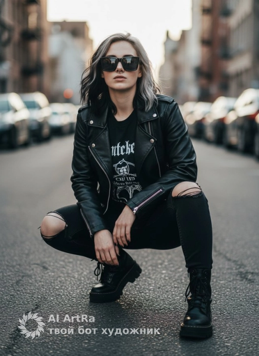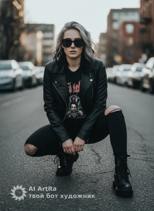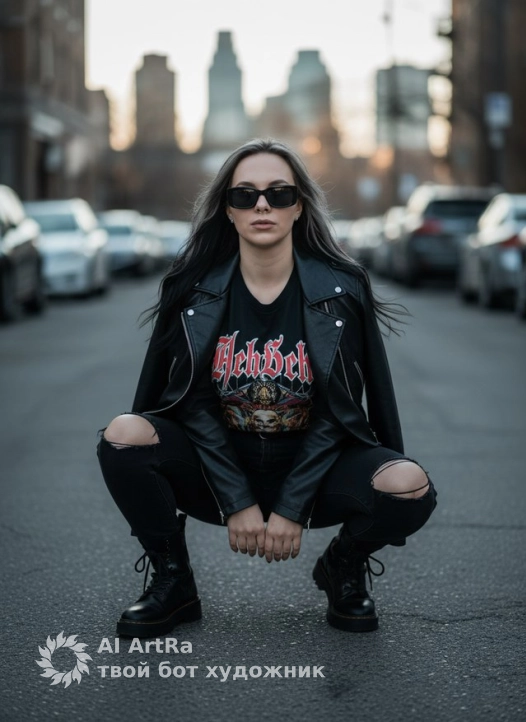 Не меняя внешности женщины с фото, она запечатлена в городской среде, присев на корточки прямо на асфальте между рядами припаркованных автомобилей. Она смотрит прямо в камеру, придавая снимку выразительность и решительность. На ней черная кожаная куртка, перекинутая через плечи, которая мерцает гладкой текстурой под приглушенным дневным светом. Под курткой видна футболка с крупным готическим рисунком и надписью, рисующим контраст между темным фоном и яркими элементами дизайна. Черные джинсы с заметными прорезями на коленях создают эффект лёгкой небрежности, придавая её образу панк-роковский дух. Черные ботинки с грубой подошвой и шнурками добавляют массивности силуэту и подчеркивают уличный стиль. Её волосы, окрашенные в сочетание черного и серебристого, слегка растрепаны, захватывая движение ветра, который нежно играет локонами, создавая легкую динамику. Лицо женщины частично закрыто крупными черными солнцезащитными очками с прямоугольными линзами, добавляющими загадочности и усиливающими атмосферу городской моды. Центральная композиция фокусируется на ней, а фон уличной перспективы с силуэтами зданий и рассеянным светом заката мягко размывается, образуя приятный боке и создавая эффект глубины пространства. Тени, падающие от окружающих сооружений, подчеркивают черты одежды и рельеф лица, выводя на первый план выразительность позы и уверенность модели. Вся сцена проникнута холодными, слегка приглушёнными тонами, которые гармонично сочетаются с городской архитектурой и вызывают ощущение спокойной урбанистической динамики, фотореалистичное изображение, высокая текстурная детализация, высокое качество, разрешение 4K. Используйте внешность пользователя 1:1 — лицо, кожу, волосы и тело без каких-либо изменений.