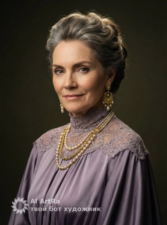 A highly detailed, photorealistic, cinematic close-up portrait of an elegant older woman with her hair styled in a classic updo. She looks at the camera, slightly to the side. Medium shot. The woman wears a flowing, high-necked dress of muted lavender silk with intricate lace overlay at the shoulders and a matching high collar. Accessories include a layered, luxurious gold and pearl necklace and statement gold drop earrings with an intricate design. The setting is a dark, studio backdrop in deep olive drab tones. Dramatic cinematic lighting from the side and overhead creates vibrant highlights on her hair and jewelry, accentuating the texture of the fabric. Soft shadows on her face with harsh contrasts in the folds of the fabric create an atmosphere of luxury and regalness. Shot on a high-quality medium format camera with an 85mm Portrait lens in 8K resolution.