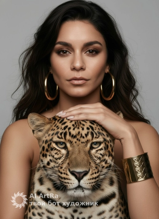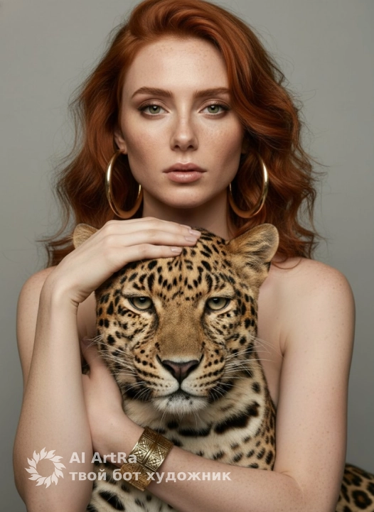 Используйте внешний вид пользователя, референса 1:1 — лицо, кожу, волосы и тело без каких-либо изменений, с безупречным естественным макияжем: матовая кожа, слегка подчеркнутые брови, тонкий слой теней на веках, едва заметный румянец и нюдовый блеск на губах; маникюр выполнен в нейтральном светлом оттенке с гладкой, полированной поверхностью ногтей; на ушах — массивные золотые кольца-гиганты, на левом запястье — широкий золотой браслет с геометрическим рельефом; главный объект — женщина, держащая на руках голову леопарда, который смотрит прямо в камеру, его морда занимает центр кадра, а её рука ласково покоится на его лбу; стиль — гиперреализм, фотография высокого разрешения с детализацией шерсти, кожи и металла; фон — однородный светло-серый, студийный, без текстур; освещение мягкое, рассеянное, фронтальное, создающее минимум теней и подчеркивающее объем; композиция — центрированный портрет, ракурс — прямой, взгляд в объектив, камера на уровне глаз; масштаб — средний план, от плеч до верхней части головы; атмосфера — спокойная, загадочная, с элементами дикой элегантности; одежда — отсутствует, тело обнажено; поза — сидя или стоя прямо, спина ровная, голова слегка наклонена вперёд, взгляд устойчивый и пронзительный.