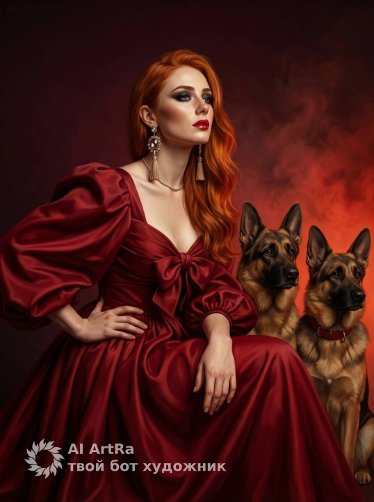 Используйте внешний вид пользователя, референса 1:1 — лицо, кожу, волосы и тело без каких-либо изменений. Женщина в пышном, глубокого красного цвета платье с объемными рукавами, завязанными на груди бантом и многослойной юбкой, сидит в полупрофиль, слегка повернувшись вправо, её правая рука лежит на колене, левая — на бедре, взгляд направлен вверх и в сторону, выражая задумчивость и величие. На лице — драматичный макияж: чётко очерченные брови, тёмный смоки-айс, ярко-красные губы с глянцевым финишем, подчёркнутые скулы и контур лица. На ушах — массивные серьги-подвески с овальными камнями и кисточками, на шее — тонкая цепочка с подвеской. Руки с ухоженными ногтями, покрытыми матовым лаком, сложены спокойно. Рядом с ней, справа, сидят две крупные собаки породы немецкая овчарка, одна чуть позади другой, обе смотрят вперёд, у одной — красный ошейник. Фон — градиентный, от тёмно-бордового до огненно-красного, с мягкими дымчатыми переходами, создающими атмосферу барочной роскоши. Освещение мягкое, боковое, с тёплым оттенком, подчёркивающее складки ткани и объём фигур. Стиль — гиперреалистичная цифровая живопись с элементами классического портретного искусства, как у Рембрандта или Рубенса. Композиция — центральная, с акцентом на фигуру женщины и собак, ракурс — средний план, с лёгким смещением камеры снизу вверх, что придаёт сцене монументальность. Атмосфера — величественная, загадочная, с нотками драматизма и благородства.