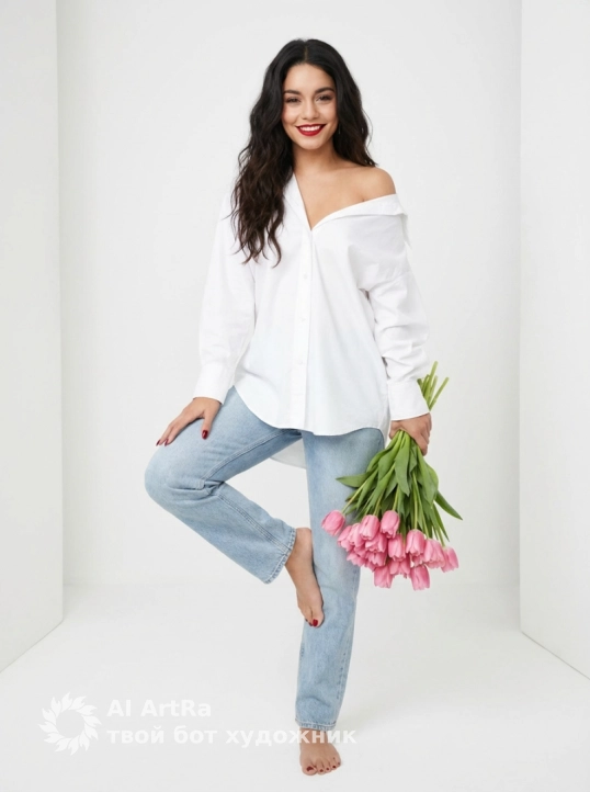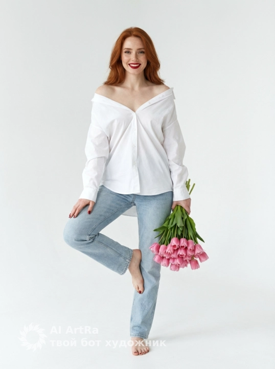 Используйте внешний вид пользователя, референса 1:1 — лицо, кожу, волосы и тело без каких-либо изменений. На изображении — женщина в расслабленной, игривой позе: одна нога согнута в колене и опирается о другую, рука лежит на бедре, другая держит крупный букет розовых тюльпанов с зелёными стеблями, прижатый к боку. Она одета в свободную белую рубашку с открытыми плечами и светлые джинсы прямого кроя, обувь отсутствует. Макияж нежный, с акцентом на губы — насыщенный красный или бордовый оттенок, тени на веках светлые, подчёркнуты брови, ресницы выделены. Она улыбается. Маникюр и педикюр выполнены в одном оттенке — насыщенный красный или бордовый лак. Украшений нет. Фон — чистая белая стена с едва заметной фактурой, пол тоже белый, создающий минималистичную студийную атмосферу. Освещение мягкое, рассеянное, студийное, без резких теней, подчеркивающее объём и текстуру ткани и цветов. Цветовая палитра — пастельная, с акцентами розового и красного, создающая весеннее, свежее, радостное настроение. Стиль — реалистичная студийная фотография с чистой композицией, фокус на фигуре и букете, ракурс фронтальный, немного снизу, масштаб — средний план, от стоп до головы, с небольшим пространством сверху. Атмосфера — лёгкая, романтичная, жизнерадостная, с ноткой непринуждённой элегантности.