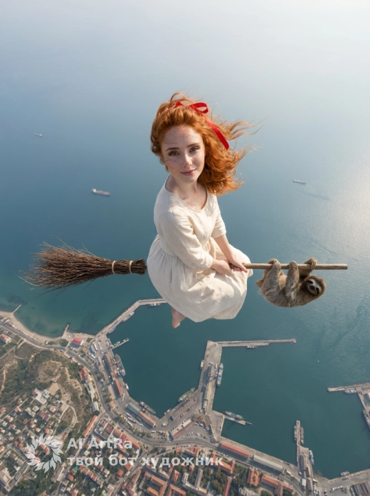 In front of the broom, or slightly ahead of the woman, a small sloth is hanging.