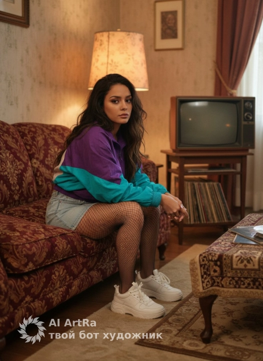 Не меняя внешности женщины с фото, она сидит на диване с богатым вышитым узором в тёплой, уютной комнате с яркими бордовыми и золотистыми тонами, пронизанными мягким светом настольной лампы с абажуром из ткани с цветочным рисунком. Девушка повернута вполоборота, её взгляд направлен слегка в камеру, передавая настроение задумчивой меланхолии или лёгкой усталости. В её образе контрастируют спортивная винтажная куртка с крупными блоками цвета — сочным фиолетовым и ярким бирюзовым — и джинсовая мини-юбка светлого оттенка, что придаёт облику современную городскую непринуждённость. Ноги девушки, покрытые чёрными сетчатыми чулками, согнуты в коленях, локти почти касаются бедер, а кисти рук расслабленно сложены вместе, словно в лёгком ожидании или раздумье. На ногах белые массивные кроссовки подчёркивают непринуждённость и повседневность, а бежевый ковёр и покрывало с орнаментом создают атмосферу домашнего уюта и ностальгии. Задний план наполнен деталями, такими как старый телевизор с закруглённым экраном и стопкой виниловых пластинок под журнальным столиком, что добавляет ретро-штрихи сцене. Тёплый, слегка рассеянный свет от лампы образует мягкие тени вокруг предметов и подчёркивает фактуру отделки стен, стены покрыты обоями с едва заметным узором, а завеса едва видна справа. Композиция несёт в себе энергетический контраст между динамичным молодёжным стилем и спокойной, почти интимной домашней обстановкой, атмосфера пронизана лёгкой меланхолией и чувством внутреннего мира. Вся сцена наполнена тёплыми приглушёнными цветами из палитры лососёвого, бордового и насыщенного коричневого, что создаёт ощущение уюта и камерности, фотореалистичное изображение, высокая текстурная детализация, высокое качество, разрешение 4K.