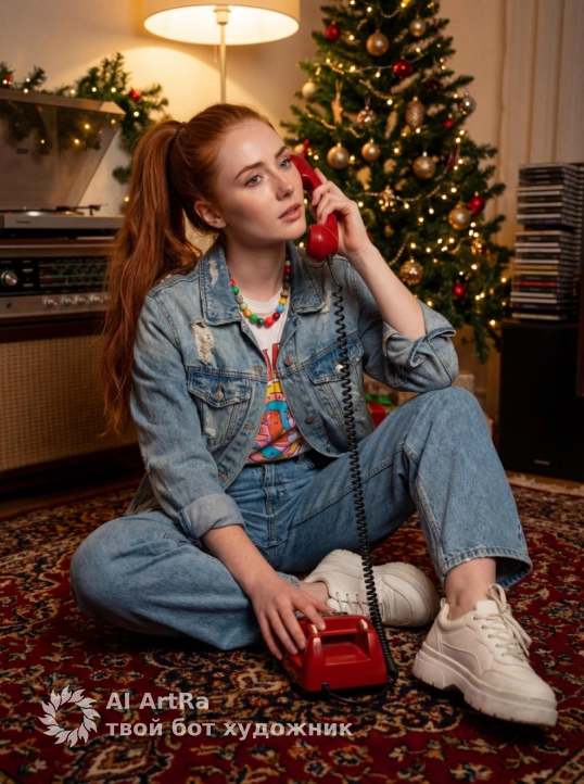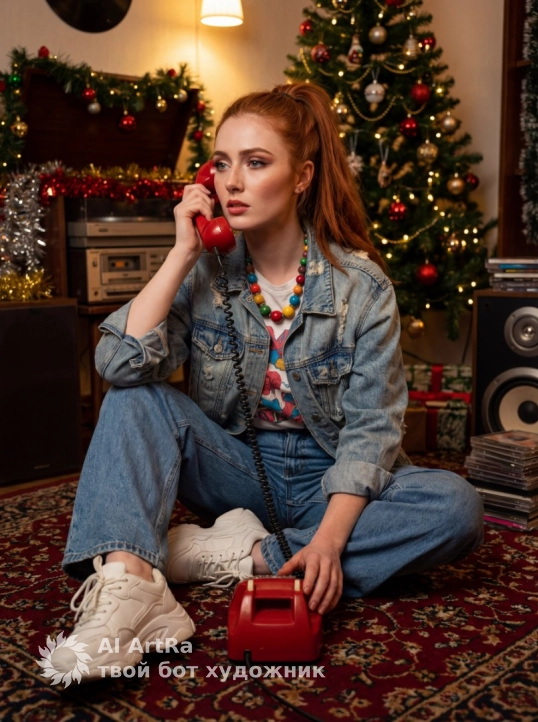 Не меняя внешности женщины с фото, она сидит на полу в уютной комнате с ярким ковром и новогодним интерьером, скрестив ноги в расслабленной позе. Женщина слегка наклонилась вперед, одной рукой держит красную трубку ретро-телефона у уха, в то время как другой опирается на корпус самого телефона, размещённого на ковре перед ней. На ней светло-голубой джинсовый костюм — изношенная джинсовка с подвернутыми рукавами и слегка потертыми участками, а также подходящие по цвету джинсы с высокой талией и свободным кроем. Под курткой видна белая футболка с ярким цветным принтом, добавляющим живости образу, а на шее красуется ожерелье из крупных разноцветных бусин. Обувь — массивные белые кроссовки с крупной подошвой, чётко выделяющиеся на фоне узорчатого ковра. Её длинные волосы собраны в высокий хвост, который свободно спадает на плечо. Лицо освещено мягким, тёплым светом, из-за которого кожа приобретает бархатистый оттенок, а выразительный макияж с акцентом на губы и глаза подчёркивает её спокойное, слегка задумчивое выражение. Атмосфера комнаты пропитана теплом праздника — на заднем плане темно-красный ковёр с изящными узорами, украшенный мишурой с мерцающими огоньками. Рядом стоит наряженная новогодняя ёлка, украшенная разноцветными шарами и гирляндами, которые создают мерцающий свет, отражающийся в стеклянных шариках. Пространство вокруг наполнено домашним уютом: в углу видны колонки и аудиотехника в ретро-стиле, а также аккуратно сложенные стопки компакт-дисков. Свет направлен в основном сверху и слева, создавая мягкие тени вокруг девушки и подчёркивая фактуру джинсовой ткани, придавая кадру особую глубину и теплоту. Общая композиция и цветовая палитра вызваны атмосферой классического праздничного вечера с элементами винтажного стиля, что создаёт ощущение ностальгии и комфорта, переданное через натуральное освещение и насыщенные теплые тона. фотореалистичное изображение, высокая текстурная детализация, высокое качество, разрешение 4K.