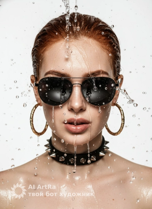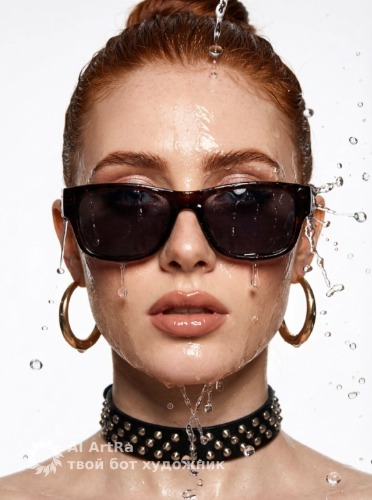 A dramatic close-up portrait of a woman wearing sunglasses, with damp, updo hair and glossy makeup, surrounded by splashes of water falling from above, creating a dynamic effect as the water splashes down her face and into the air. Extreme close-up, centered composition focusing on the woman's face, sunglasses, and water droplets. 3/4 perspective. Bold and glossy makeup, glossy nude-pink lips, and an even skin tone. Her hair is wet and slicked back. She wears a studded choker and large gold hoop earrings. Indoors, a professional photo studio against a simple, seamless white backdrop. Bright, high-contrast studio lighting, likely with a hard light source, highlights the shine of her skin, glossy lips, and wet surfaces. The light perfectly captures the details of each water droplet, creating strong highlights. Shot with a 100mm macro lens, photorealistic.