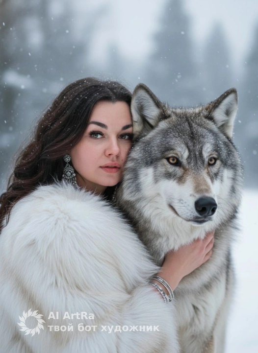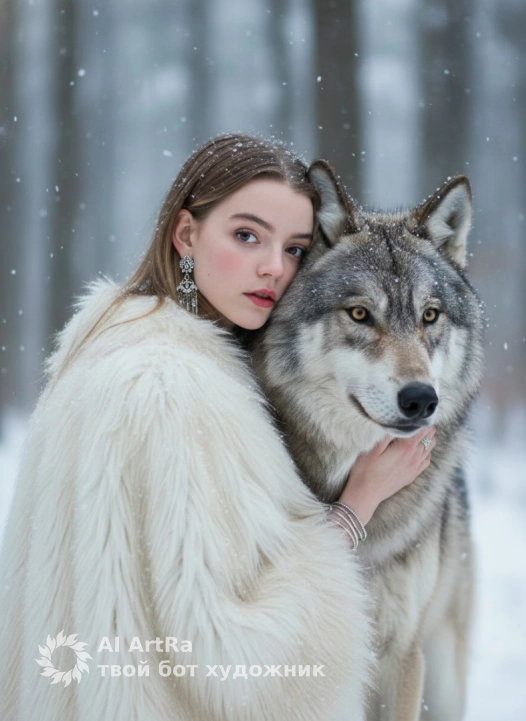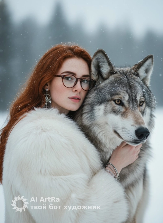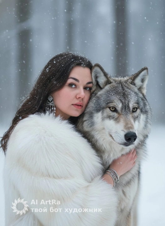 Кадр вертикальный, построен так, что фигуры девушки и волка занимают почти весь кадр по высоте и ширине, оставляя только немного воздуха сверху и по бокам. Use the user's appearance 1:1 — face, skin, hair and body without any changes.