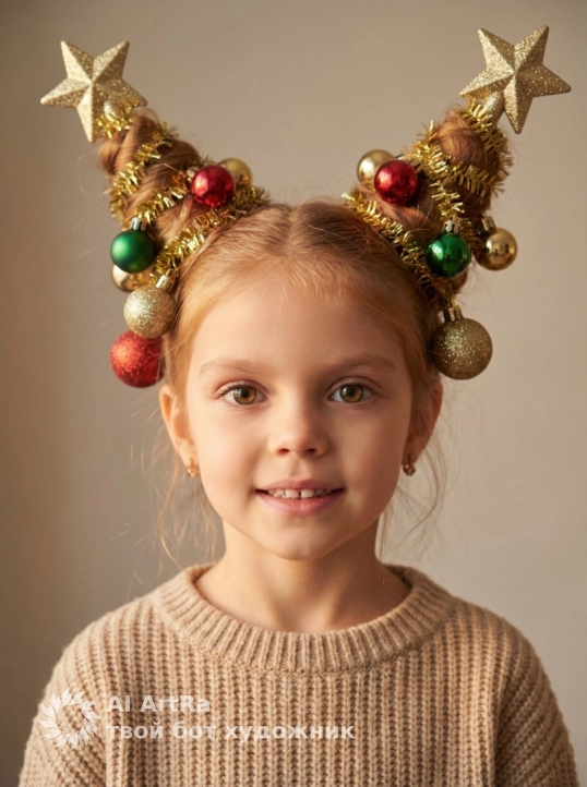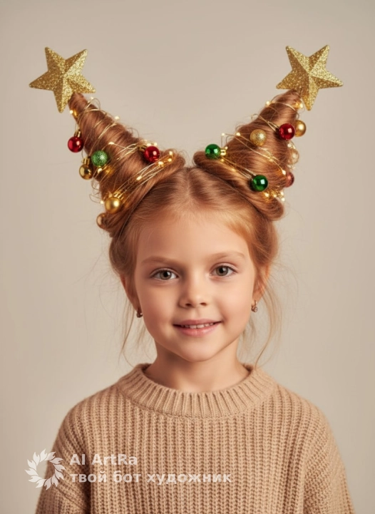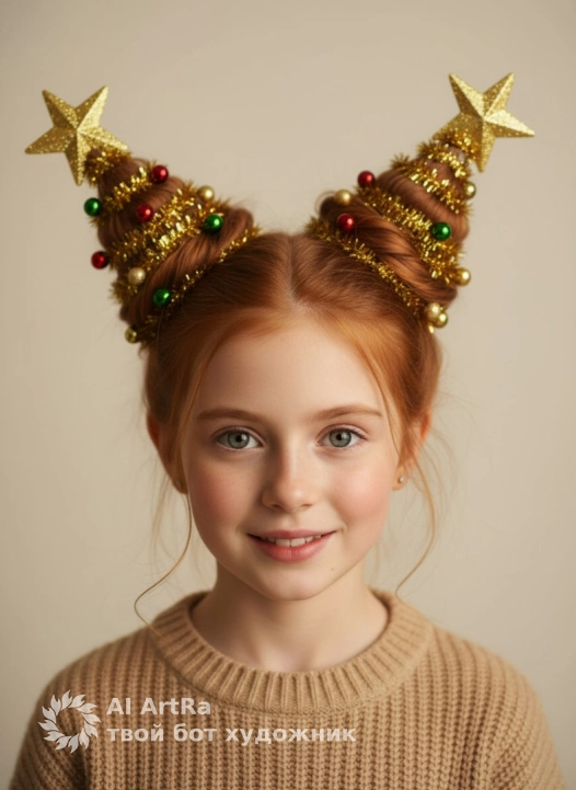 Не меняя внешности человека с фото, на снимке изображена маленькая девочка с двумя забавными конусообразными причёсками, украшенными, словно новогодними ёлками, с переплетёнными золотистыми гирляндами и разноцветными декоративными шариками красного, зелёного и золотистого оттенков, венчающими каждую причёску крупные блестящие звёзды золотистого цвета. Её светло-рыжие волосы аккуратно зачесаны и свернуты вверх в симметричные высокие пучки, при этом отдельные тонкие пряди мягко выбиваются и создают ощущение легкой воздушности и живости образа. Лицо девочки освещено мягким, тёплым светом, который придаёт её коже нежный персиковый оттенок и подчёркивает ясность и блеск больших глаз, обращённых прямо в камеру, что создаёт ощущение искреннего и дружелюбного взгляда. Неяркий, но достаточно контрастный свет формирует мягкие тени по контурам лица, выделяя румянец на щёчках и мягкость детской улыбки с небольшими, аккуратными зубками. Девочка одета в тёплый свитер песочного цвета с заметной фактурой вязки, которая добавляет образу уюта и домашнего тепла. Фон – размытый и нейтральный, светло-бежевого происхождения, без ярких деталей, что помогает сосредоточить всё внимание на лице и причёсках ребёнка, создавая интимную и спокойную атмосферу. Композиция снимка сосредоточена на портрете, выполнена в мягких природных тонах с деликатной цветовой гаммой, передающей атмосферу тёплого зимнего дня, наполненного радостью и беззаботностью, наполненная духом лёгкого праздника и детского волшебства, характерного для новогодних праздников. Рассветное освещение и приглушённые тени создают ощущение глубины и объёма, превращая простой портрет в трогательную киноверсию детской радости, фотореалистичное изображение, высокая текстурная детализация, высокое качество, разрешение 8K.
