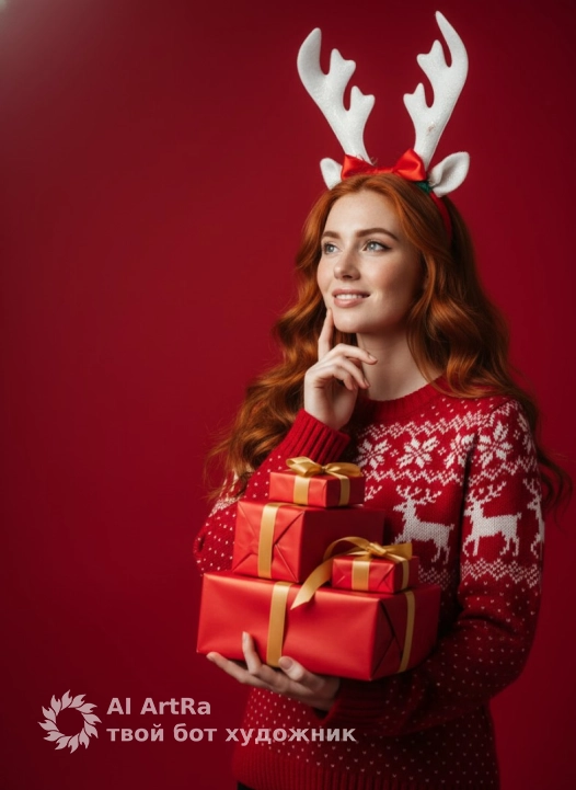 Используйте внешний вид пользователя, референса 1:1 — лицо, кожу, волосы и тело без каких-либо изменений, с естественным, свежим макияжем: легкий румянец на щеках, нюдовый блеск на губах, акцент на глазах с тонкой стрелкой и светлым хайлайтером на скулах; маникюр — короткие ногти с матовым нюдовым покрытием; на голове — белые блестящие оленьи рога с красной лентой; на теле — красный вязаный свитер с белым узором в виде снежинок и оленей; в руках — три аккуратно упакованных подарка в красной бумаге с золотыми лентами и бантиками; поза — стоя, слегка повернута влево, одна рука придерживает подарки, другая подбородок, взгляд задумчиво-радостный вверх вправо; фон — однотонный насыщенный красный, студийный; освещение мягкое, фронтальное, с легким боковым контуром, подчеркивающим объем; стиль — реалистичная студийная фотография высокого разрешения; композиция — средний план, объект занимает правую часть кадра, слева — свободное пространство; атмосфера — праздничная, теплая, волшебная, с ноткой ожидания чуда.