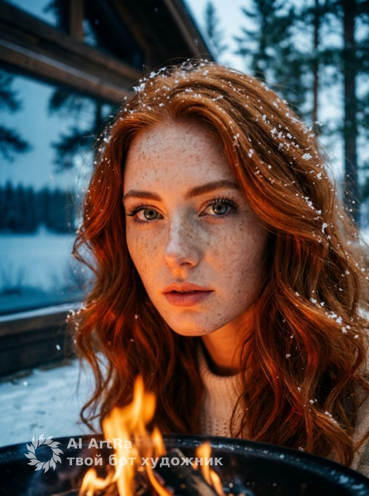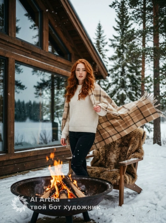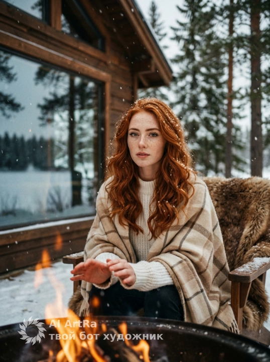 Не меняй черты лица. Создайте портрет в кинематографической стиле с эффектом зерна, женщины, сидящей на улице зимой на деревянном стуле на стуле шкура меховая коричневая. Идёт легкий снег. Она в белом вязанном свитере и сверху накинут плед бежевый большой. Её волосы уложены в свободные волны частично падая на лицо, а макияж естественный, ресницы длинные.