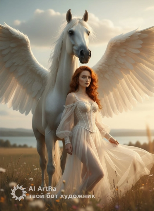 Не меняя внешности девушки с фото, сцена с нежным светом и воздушной атмосферой. Девушка стоит полубоком, голову склонена вниз и в сторону, взгляд сосредоточен вне кадра, черты лица выражают задумчивость и спокойствие. Она в длинном прозрачном светлом платье с корсетом и тонкими рукавами, материал струится вокруг, играя с ветром. Волосы длинные, волнистые, свободно падают на плечи и грудь, контрастируя с кожей. Позади крупная белая лошадь с расправленными большими пушистыми крыльями(пегас)свет подчеркивает объем и текстуру перьев и силуэт животного.Фон – размытый пейзаж с голубовато-серым небом, облаками и водным пространством,трава и полевые цветы внизу размыты.Теплая тональность с золотистыми оттенками, словно утро или закат, создает сказочность и умиротворение. Композиция:девушка и лошадь в центре, линия от головы до крыльев и низа платья усиливает гармонию. Свет и тени играют на поверхностях, образ объемный и живой, романтическое и магическое настроение. Фотореалистичное, высокая детализация, качество 8K.