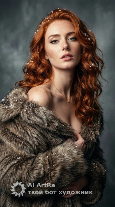 POSE: Half-turn pose, leaning slightly forward. Shoulders wrapped in fur, hands partially tucked into the fur at the chest. Strong, deep, confident gaze directly into the camera. Micro-lifted chin, lips slightly parted.