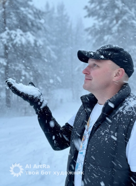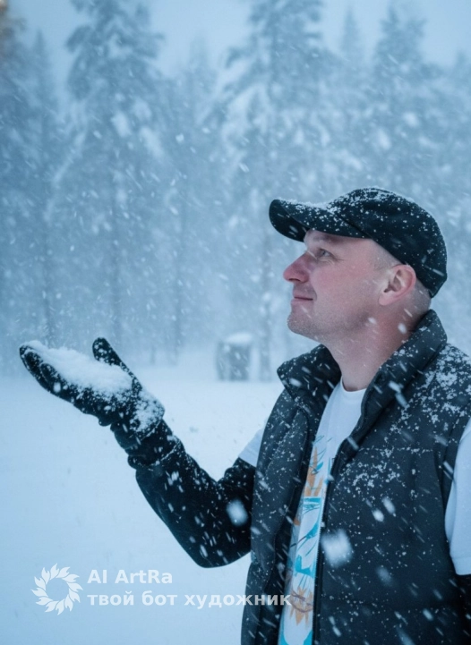 Create an ultra-realistic 8K cinematic shot of a handsome young man (use the uploaded image without any facial modifications) somiring the snowfall during a heavy snowstorm. The shot should be a side view composition, showing half of his face from the left side, capturing the moment as he gazes in awe at the falling snow. Используйте внешность пользователя 1:1 — лицо, кожу, волосы и тело без каких-либо изменений.