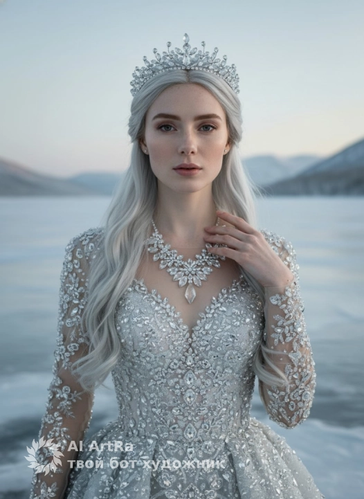 Main prompt: Waist-up portrait of an ice queen standing in front of a frozen lake in pale grey-blue dawn light. She gently touches her crystal necklace with one hand while looking into the camera. Silver-white hair flows down her chest with a few loose strands moved by a light breeze. Delicate crystal-lace tiara with many small sparkling facets. Her gown is covered in dense icy embroidery and gemstone patterns that reflect the cold sky. Soft, even lighting with realistic skin tones and finely rendered facial details.