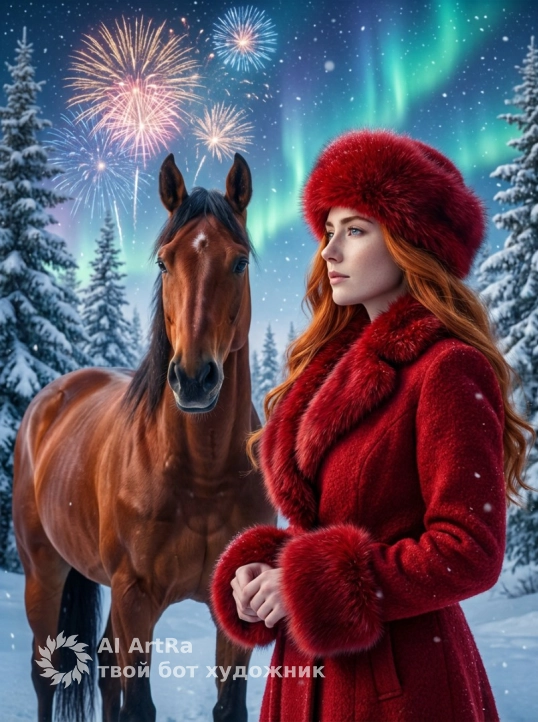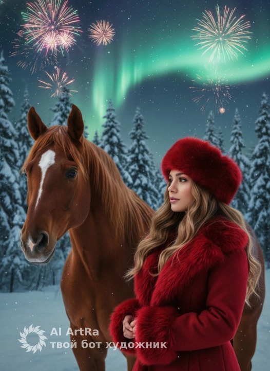 Не меняя внешности женщины с фото, перед нами предстает изящная молодая женщина в профиль, повернутая чуть вправо и смотрящая вдаль с задумчивой и спокойной выразительностью глаз. Она одета в роскошное толстое красное пальто с выразительной текстурой, украшенное толстой меховой опушкой на воротнике и манжетах, что придает образу уют и теплоту в морозном зимнем пейзаже. На голове у нее шапка из пушистого красного меха, гармонично сочетающаяся по цвету с пальто, создавая ощущение комфорта и защищенности от стужи. Ее волосы, ниспадающие на плечо, каждая прядь прорисована с невероятной детализацией, отражая холодный свет зимнего дня. Руки женщины сложены перед собой, кисти видны отчетливо, пальцы неразличимы по деталям. Рядом с ней стоит мощный рыжевато-каштановый конь с темной гривой и хвостом, морда животного обращена прямо к зрителю, силуэт мускулистый и выразительный, шерсть блестит под холодным светом, детали анатомии четко видны. Фоном служит заснеженный лес с высокими елками, покрытыми снегом, придающими сцене тонкий контраст и глубину. В небе сверкают фейерверки ярких огней и мерцают снежинки, а за ними тянутся волны северного сияния, мягко окрашивающие ночное небо в оттенки зеленого и синего. Общая атмосфера наполнена торжеством и волшебным ожиданием, композиция наполнена кинематографической глубиной, мягким светом и насыщенными цветами, что подчеркивает праздничное и зимнее настроение, фотореалистичное изображение, высокая текстурная детализация, высокое качество, разрешение 8K.