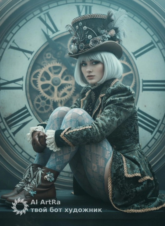 Сказочный нео‑винтажный портрет молодой девушки, (референс 1:1) сидит полубоком, обняв колени, на фоне гигантского старинного циферблата с римскими цифрами; костюм в стиле викторианский/стимпанк арлекин: стёганые объёмные рукава, кружевные манжеты, перчатки; цилиндр, густо украшенный перьями, цветами и тесьмой; светлые серебристо‑белые волосы каре; высокие кружевные чулки с ромбичным арлекинским узором в пыльно‑голубой палитре; винтажные шнурованные ботинки с лентами и цветочными аппликациями; богатые фактуры ткани (жаккард, кружево, бархат), патина на металле часов; мягкий рассеянный свет, тонкая дымка, shallow DOF; центрированная композиция, взгляд прямо в камеру, крупный портрет; кинематографичный холодный blue–teal тон, матовый плёночный лук, тонкая плёночная зернистость; photorealistic, ultra‑detailed, 85mm, f/1.8, HDR, safe for work