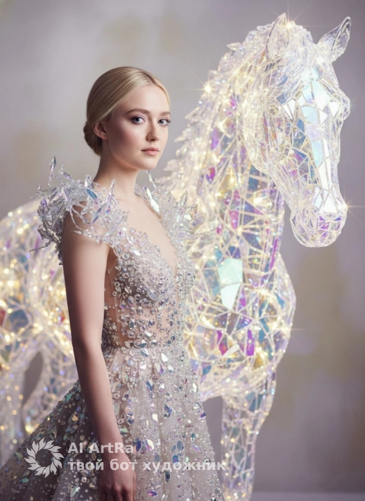 Не меняя внешности женщины с фото, перед нами изысканная сцена с мягким рассеянным светом, создающим нежное сияние и сказочное великолепие. Женщина стоит в три четверти вперед, тело повернуто вправо, взгляд уверен и спокоен, передает торжественное спокойствие. На ней роскошное платье, усыпанное переливающимися кристаллами, создающими блики и сверкающие контуры; ткань прозрачна в местах, украшена блестящими элементами, подчеркивающими изящество и тонкость силуэта. Плечи обрамлены объемными кристаллическими украшениями, похожими на хрупкие ледяные ветви, добавляющими аристократичность. Волосы собраны в гладкий низкий пучок, открывая шею; лицо с нежным мерцающим макияжем на скулах, подчеркивающим утонченность. Справа большая фигура коня из прозрачных переливающихся кристаллов с световыми акцентами, придающими сказочный и магический характер. Свет создает звездчатые блики и хрустальный блеск, контрастируя с мягким размытым фоном в серо-бежево-лавандовых тонах. Освещение подчеркивает объем и глубину, формируя мягкие тени, придающие минималистично-элегантную динамику; чистота мотивов усиливает мистическую красоту и изящество. Детали натуральны, передают сдержанную элегантность и величие, словно замороженный момент в кристалле времени, где каждая грань светится своей жизнью, а женщина и конь образуют гармоничный ансамбль. Фотореалистичное изображение, высокая детализация, качество 4к.
