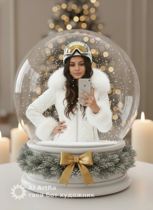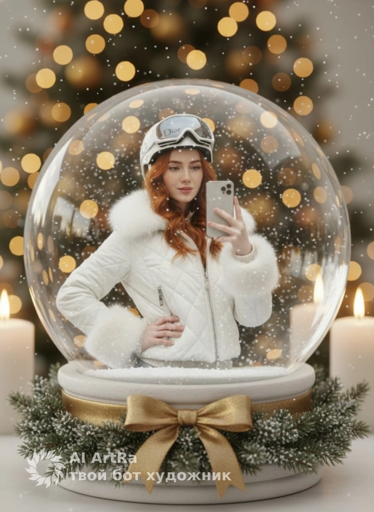 Используйте внешний вид пользователя, референса 1:1 — лицо, кожу, волосы и тело без каких-либо изменений. Гиперреалистичное изображение женщины внутри прозрачного снежного шара, держащей в руке серебристый смартфон для селфи, позирующей с одной рукой на бедре, в белой стеганой куртке с меховыми манжетами и воротником, белом шлеме с логотипом «Dior» и лыжными очками на шлеме; снежный шар установлен на белой подставке с золотым бантом и венком из зеленых еловых веток, посыпанных снегом, фон украшен размытыми теплыми огнями рождественской елки и горящими свечами, создающими уютную атмосферу, снежинки плавно кружатся внутри шара, мягкий рассеянный свет подчеркивает детали, композиция центрирована на шаре с глубоким боке, передавая праздничное волшебство и современный зимний лайфстайл.