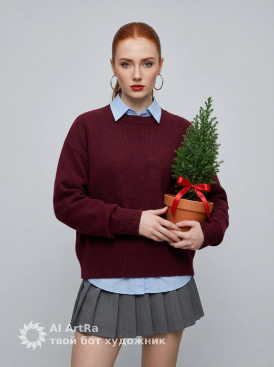Создай портрет, не меняя черты лица. Женщина , с дерзким взглядом, в бордовом (цвета марсала) оверсайз шерстяном свитере с круглым вырезом, надетом поверх светло-голубой классической рубашки. Теннисная серая мини юбка. Волосы уложены в гладкий хвост. На ушах серьги в серебряном цвете. Она держит в руках небольшой горшок с миниатюрным хвойным деревцем, украшенным красной лентой. Фон светло серый. . Студийный свет, рекламный снимок, высокое качество, реализм.