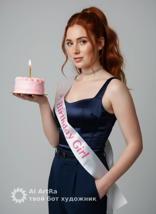 A medium shot studio portrait of a woman with a ribbon over her shoulder that says "Birthday Girl." Her hair is pulled back into a high voluminous ponytail. She holds a small pink birthday cake with a lit candle in one hand and looks at the camera, while her other hand is in her pocket. Medium shot, eye-level perspective. She has natural makeup with light pink lips. She has a wide white ribbon over her shoulder that says "Birthday Girl" with a pink inscription. She wears a dark blue satin sleeveless corset and dark blue high-waisted trousers with a black thin belt. She has a sparkling silver choker necklace around her neck. Indoor shooting in a professional photo studio against a plain, seamless light gray background. Soft, diffused, and even studio lighting. The flaming candle on the cake adds warm light. Shot with an 85mm portrait lens, shallow depth of field, photorealistic.