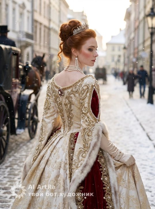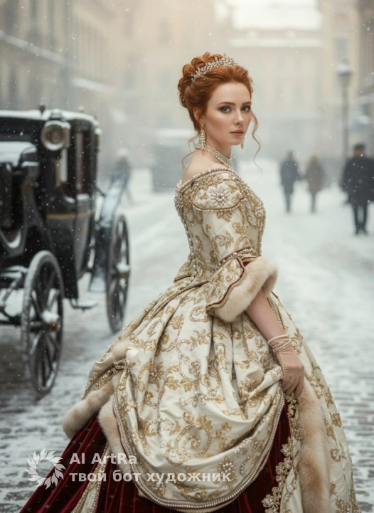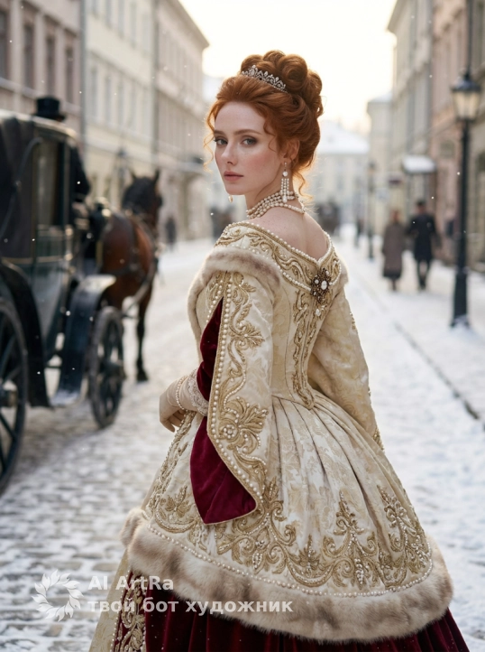 Ультрореалистичный портрет аристократки в историческом образе: вид сзади в три четверти на заснеженной мощёной улице XIX века, слева — конная карета, в глубине — размытая городская архитектура и прохожие; платье — роскошное кремово‑золотое бальное платье с богатой ручной вышивкой, бисером и жемчужными аппликациями, подол с насыщенно‑красными бархатными вставками и мягкой меховой драпировкой; причёска — высокий пучок с мягкими завитками и декоративной тиарой, несколько свободных локонов; аксессуары — многорядное жемчужное ожерелье, длинные подвесные жемчужные серьги, тонкие перчатки и декоративная брошь на спине платья; макияж — фарфоровый тон, лёгкий румянец, мягкий дымчатый макияж глаз с подчёркнутыми ресницами, натуральные аккуратные брови, нюдово‑розовые губы, деликатный подсвет кожи; поза — корпус повернут в три четверти к камере, голова слегка обернута через плечо, одна рука нежно держит подол платья, линия плеч элегантна и расслаблена; атмосфера — мягкий рассеянный зимний дневной свет с кинематографичным контровым свечением, падающий снег, лёгкая дымка, тёплые рефлексы на украшениях, выраженная текстура тканей, мелкие блики на бисере; технические указания — сверхвысокая детализация, реалистичная передача ткани, меха и металлов, shallow depth of field, мягкое боке, натуральная цветопередача, киношная тональность, 85mm, f/1.8, низкий ISO, тонкая зернистость пленки. RAW photo, 8k, cinematiclighting, сохрани черты лица