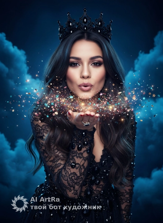 • Украшения: На голове массивная черная корона (тиара) с замысловатым узором. На пальце — изящное кольцо, ногти накрашены ярко-красным лаком.