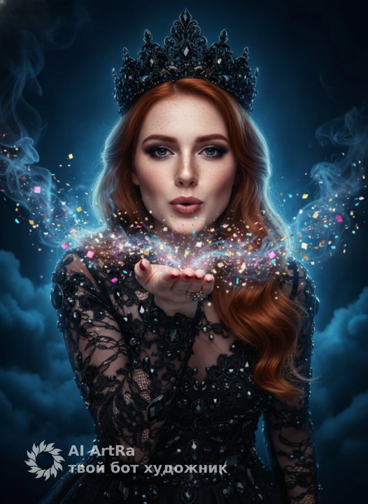 Студийный портрет молодой женщины в стиле фэнтези или «dark glam», снятый в фас (front view). Героиня посылает воздушный поцелуй, сдувая с ладони облако разноцветных блесток и конфетти. Композиция динамичная, создающая магический эффект за счет разлетающихся частиц и дыма.