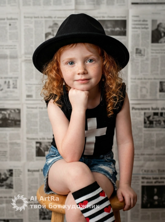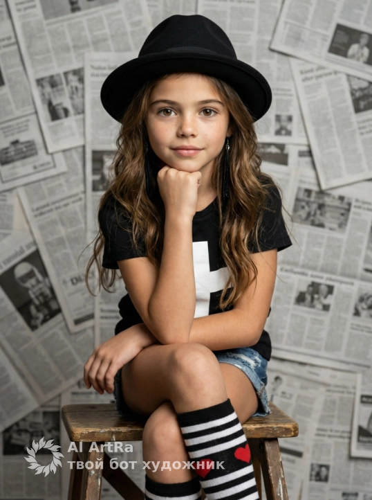 Используйте внешний вид пользователя, референса 1:1 — лицо, кожу, волосы и тело без каких-либо изменений. Девочка сидит на деревянном табурете, опираясь локтем о колено и подбородком на кулак, взгляд направлен прямо в камеру с лёгкой задумчивой улыбкой; на голове — чёрная фетровая шляпа-федора с узкой тульей и загнутыми полями, на плечах — чёрный топ с белым крестом на груди, на ногах — рваные джинсовые шорты и высокие носки с черно-белой полосатой текстурой и красными сердцами на икрах; на ушах — длинные чёрные серьги-подвески; фон — стена, полностью покрытая разложенными газетными страницами в монохромной гамме, создающая текстурированный, слегка хаотичный фон; освещение мягкое, студийное, с лёгким боковым светом, подчеркивающим объём и детали одежды; стиль — реалистичная студийная фотография с элементами стиля «street fashion»; композиция — средний план, ракурс немного снизу, акцент на лице и верхней части тела; атмосфера — игривая, немного бунтарская, с ноткой ностальгии и стиля 90-х; цветовая палитра — контрастная, с доминированием чёрного, белого и синего, яркие акценты красного в виде сердец; детали — видны складки ткани, потертости джинсов, текстура шляпы и газет, тонкие тени под подбородком и на шее.
