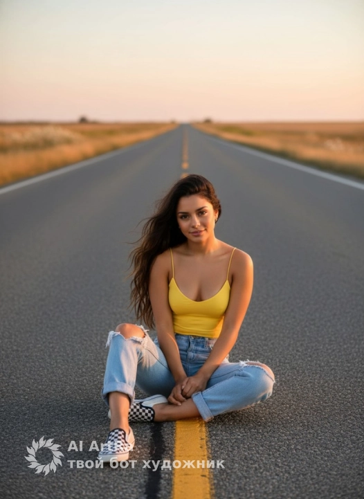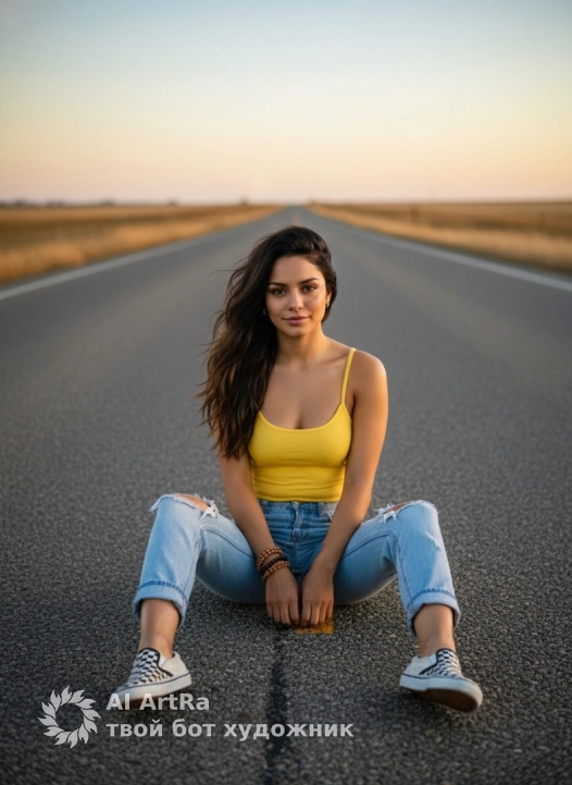 Не меняя внешности женщины с фото, она сидит прямо посередине безлюдной асфальтовой дороги, расстелив ноги в расслабленной, но уверенной позе — одна нога согнута в колене, другая вытянута чуть дальше, стопы упираются в покрытие, на ней светло-голубые рваные джинсы с закатанными до щиколоток краями. На верхней части тела простое облегающее майкоподобное ярко-жёлтое трико с узкими бретелями, открывающее плечи и подчёркивающее изящную линию рук и грудной клетки, кожа светится на боковом освещении, подчёркивая природный, немного загорелый тон. Её длинные тёмные волосы распущены и свободно ниспадают чуть ниже плеч, играя на ветру и создавая ощущение лёгкости, мягко обрамляя лицо с чёткими чертами, с выражением спокойной внутренней гармонии и лёгкой улыбкой, взгляд направлен прямо в объектив камеры, придавая снимку интимность и живость. Обувь на ногах — слипоны с чётким узором в шахматную клетку, выглядят лёгкими и удобными, добавляя смеси повседневности и стиля в кадр. Асфальтовая дорога словно тянется в бесконечность, с едва различимой жёлтой пунктирной разметкой в центре, она создаёт эффект ведущей линии, уводящей взгляд зрителя к горизонту. По сторонам дороги виднеются размытые, едва заметные травянистые поля в золотисто-коричневых тонах, в которых рассвет или закат окрашивает небосвод в светлые и мягкие оранжево-голубые оттенки, наполняя сцену атмосферой тёплого, мечтательного времени суток. Её тело и лицо обрамлены естественным рассеянным светом, создающим лёгкие мягкие тени, что добавляет глубину и объём, придавая кадру утонченную кинематографичность и драматизм. Композиция построена так, что центральное расположение женщины и строгие линии дороги подчёркивают её как главный объект, передавая ощущение покоя и свободы, на фоне большого открытого пространства. фотореалистичное изображение, высокая текстурная детализация, высокое качество, разрешение 4K.