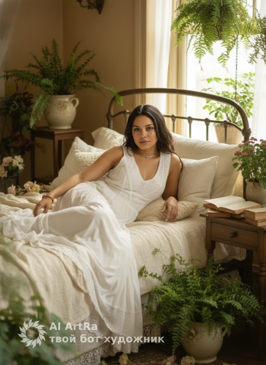 The shooting location is a cozy room in a vintage bohemian style with soft natural light coming through the window. This light creates a warm, soft glow, highlighting the woman's skin and accentuating the texture of the fabric and plants in the frame. The walls are painted beige. The bed is vintage metal, slightly worn.