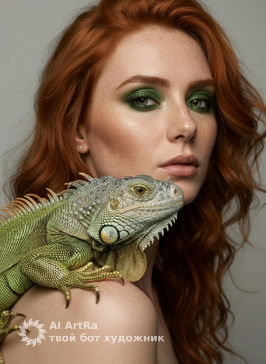Используйте внешний вид пользователя, референса 1:1 — лицо, кожу, волосы и тело без каких-либо изменений. На плече женщины, повернутой вполоборота к камере, сидит живая зелёная игуана с чётко прорисованными чешуйками, шипами вдоль спины и выразительными глазами, её лапы устойчиво держатся на коже; макияж выполнен в стиле драматичного смоуки-айса с насыщенным зелёным тенями, чётким чёрным карандашом по верхнему веку и акцентом на ресницах, губы естественного оттенка с лёгким блеском; на лице — безупречный тональный крем и скульптурирующий румянец; маникюр и педикюр отсутствуют, украшений нет; стиль — высокодетализированная студийная фотография с мягким рассеянным освещением, создающим естественные блики на коже и чешуе; фон — однородный светло-серый, без текстур и отвлекающих элементов; композиция — средний план, ракурс слегка снизу, акцент на взгляде женщины и позе игуаны; атмосфера — загадочная, спокойная, с ноткой экзотической элегантности; одежда отсутствует, поза — расслабленная, с лёгким наклоном головы и прямым взглядом в объектив; масштаб — тело видно от ключиц до верхней части спины, игуана занимает центральную часть кадра, её хвост мягко изгибается вдоль плеча.