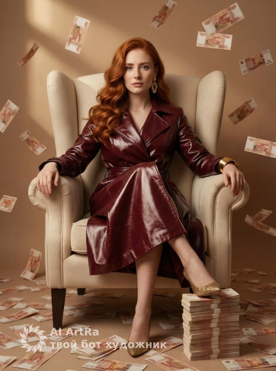 Не меняя внешности женщины с фото, в центре кадра сидит уверенная в себе молодая женщина в длинном бордовом лаковом пальто, которое красиво отражает мягкий свет, падающий сверху и слева. Она расслабленно располагается в массивном кремовом кресле с широкой спинкой и объемными подлокотниками, при этом одна нога скрещена на другую, а левая опирается на высокую стопку купюр, сложенных аккуратным ровным столбиком. Её поза излучает спокойствие и силу, взгляд направлен прямо в камеру, выражение лица спокойно и сосредоточенно, сохраняя индивидуальность, волосы распущены крупными мягкими волнами, подчеркивающими элегантность образа. Образ дополняют крупные золотистые серьги с изящным узором и широкий браслет на запястье правой руки, которая свободно лежит на подлокотнике. Обувь – золотистые туфли с блестками, придающие финальный акцент богатству и изящности. Вокруг на фоне монохромной стены и покрытом банкнотами полу, купюры 5000 рублей парят в воздухе словно в замедленном падении, создавая атмосферу изобилия и роскоши, которая мягко контрастирует со строгими линиями интерьера. Тени легки, но достаточно четки, добавляя глубины и объема композиции, создавая ощущение кинематографической сцены, где каждый элемент помогает рассказать историю о силе и контроле. Вся сцена выдержана в теплых, приглушенных коричнево-бежевых тонах с акцентом на багровый блеск пальто, формируя гармоничное и изысканное цветовое решение, подчеркивающее атмосферу уверенного верховенства, фотореалистичное изображение, высокая текстурная детализация, высокое качество, разрешение 4K.