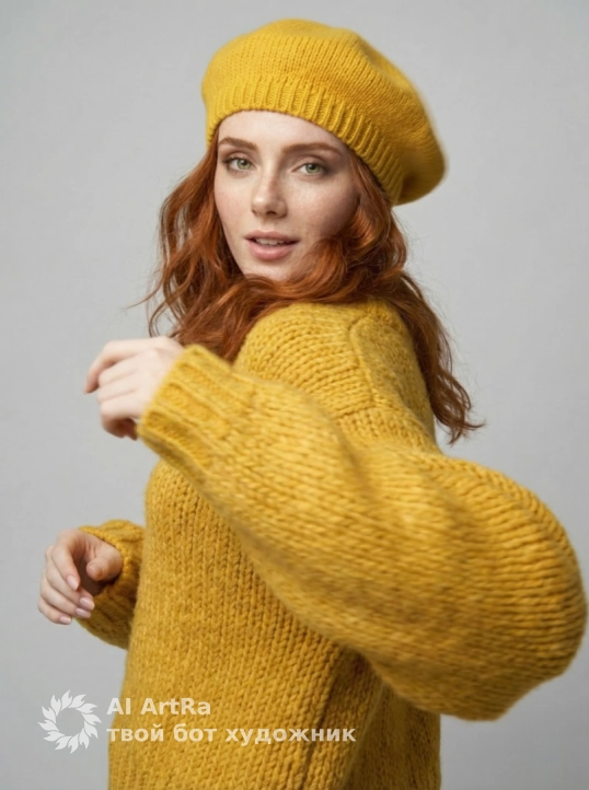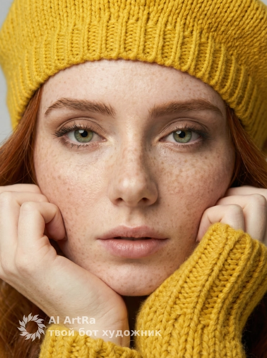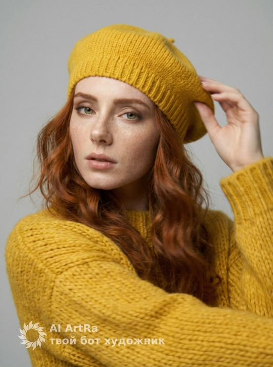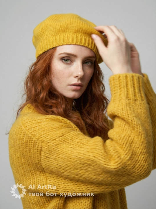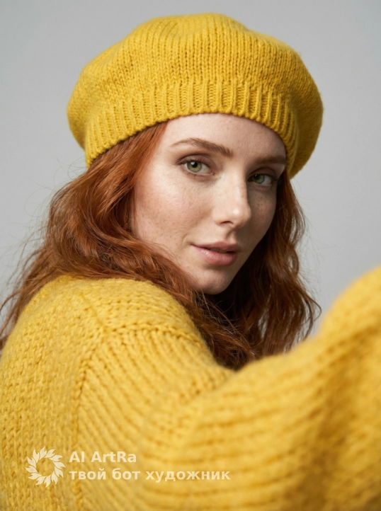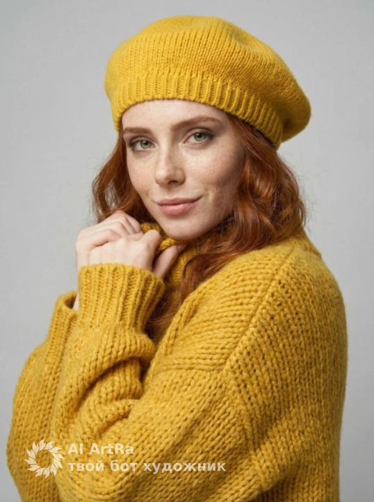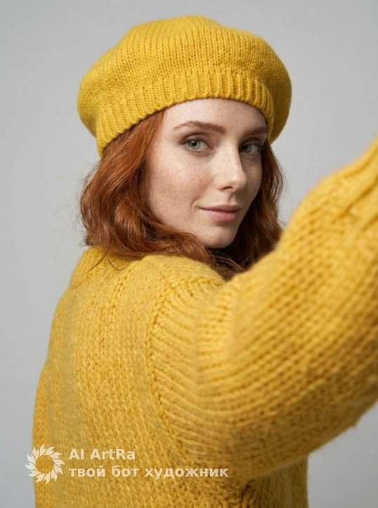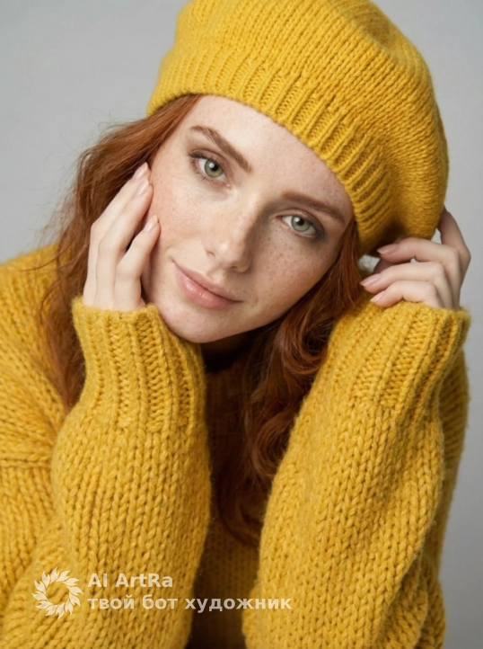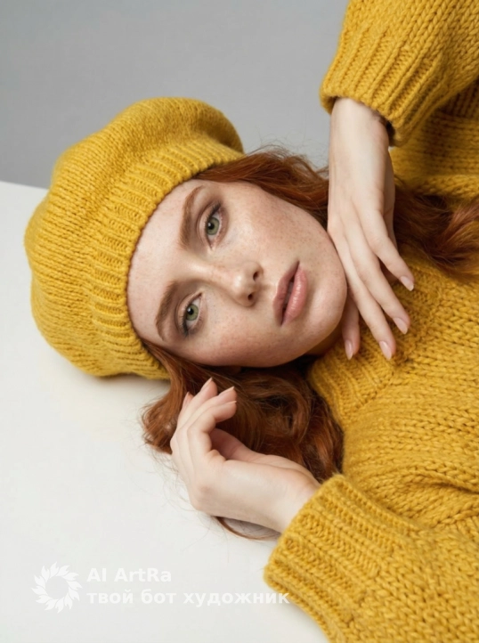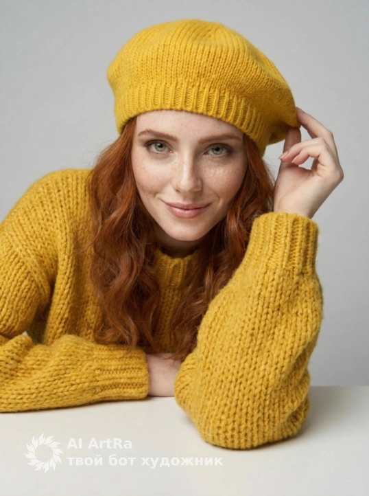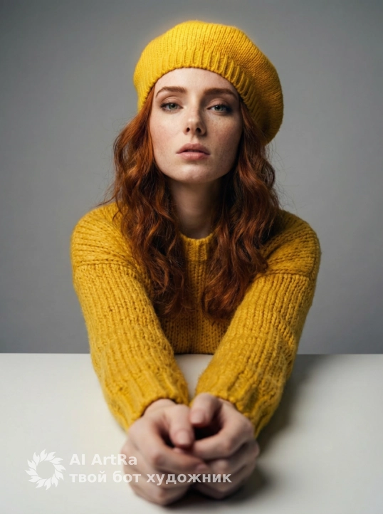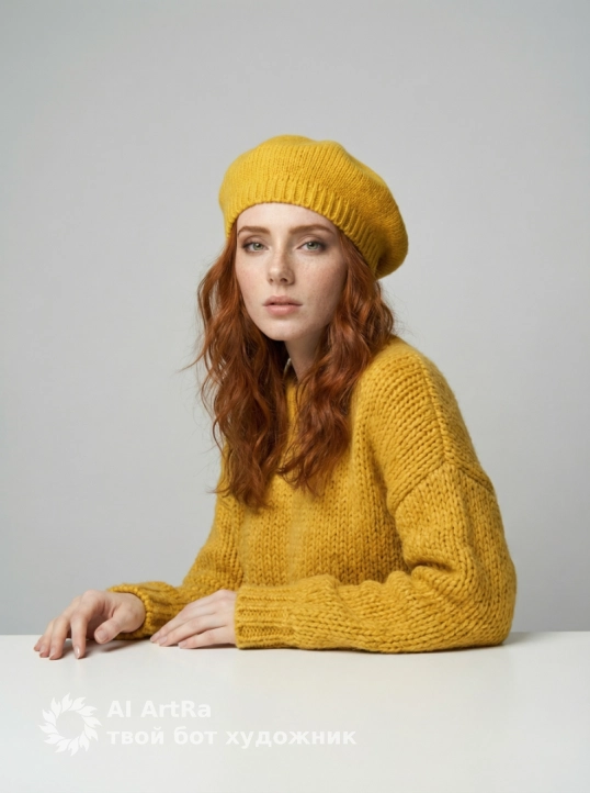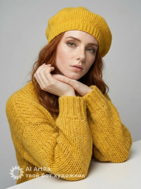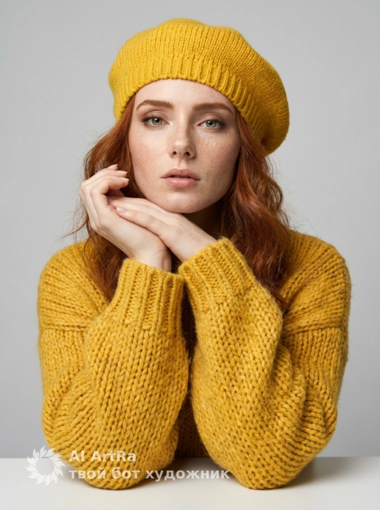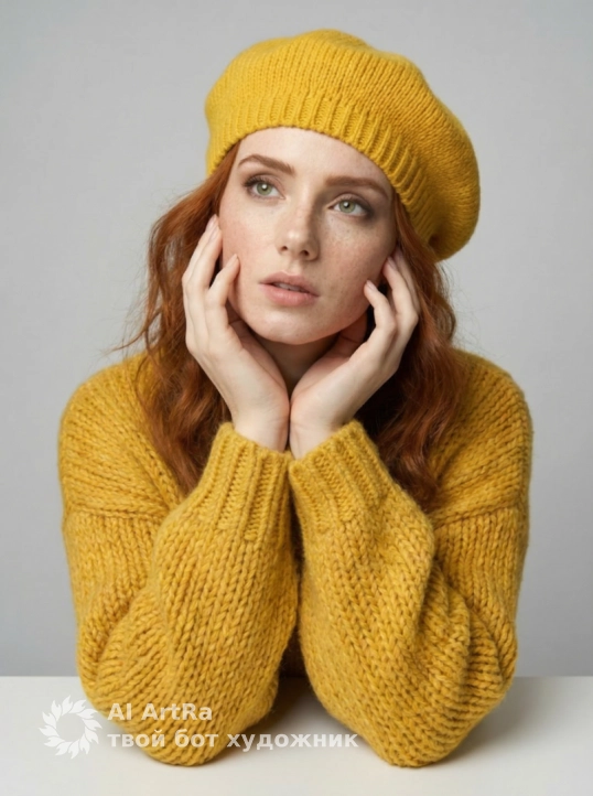 Используйте внешний вид пользователя, референса 1:1 — лицо, кожу, волосы и тело без каких-либо изменений. На изображении — женщина в ярко-желтом вязаном берете и объемном свитере с крупной фактурой, сидящая за белым столом, подбородок опирается на сложенные руки, пальцы с естественным, слегка матовым маникюром, ногти короткие, ухоженные, без лака. Макияж естественный — акцент на свежем, сияющем лице, легкий румянец, мягкий контур губ с нейтральным оттенком, брови естественно очерчены, ресницы подкручены, но без объема. Украшений нет. Стиль — реалистичная студийная фотография с мягким, рассеянным освещением, создающим нежные тени и подчеркивающим текстуру вязки и кожи. Фон — однотонный светло-серый, чистый, без деталей, что акцентирует внимание на модели. Композиция — средний план, ракурс немного снизу, взгляд направлен прямо в камеру с теплой, дружелюбной улыбкой, создавая ощущение близости и уюта. Атмосфера — спокойная, уютная, осенне-весенняя, с ноткой ностальгии и нежности.