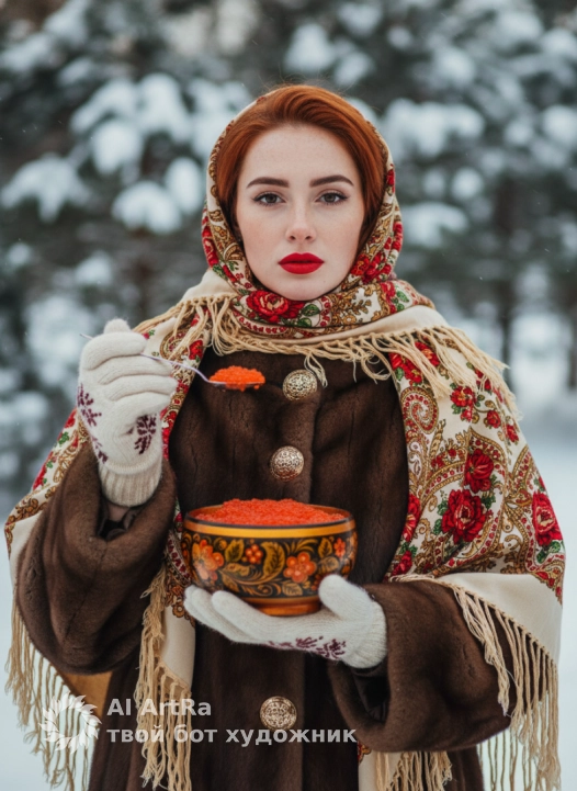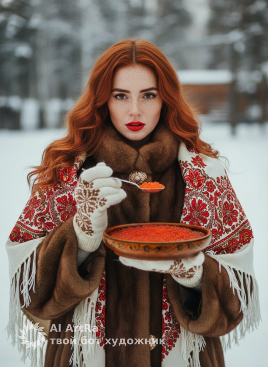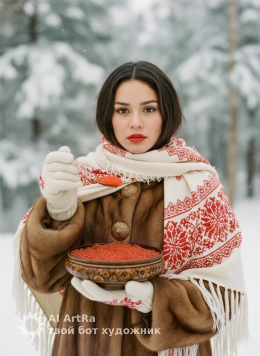 A woman holds a deep plate of bright red caviar and a small silver spoon, holding the spoon in the air, caviar plate wooden Russian folklore. Medium shot, eye-level perspective, woman looking at the camera with a serious face, natural makeup with bright red lipstick, dressed in a luxurious brown fur coat with large decorative buttons, long white and red Russian ornament scarf with fringe draped over her shoulders, white wool gloves with embroidered patterns, against a backdrop with blurred snow-covered trees in the background, soft diffused light, side lighting casts soft shadows on her face, soft shadows blending with the background, warm and cozy atmosphere, shot with a 135-mm portrait lens, shallow depth of field with bokeh background, film photography style with fine grain, 8K resolution, earthy color palette with warm browns and soft whites, high detail, photorealistic.