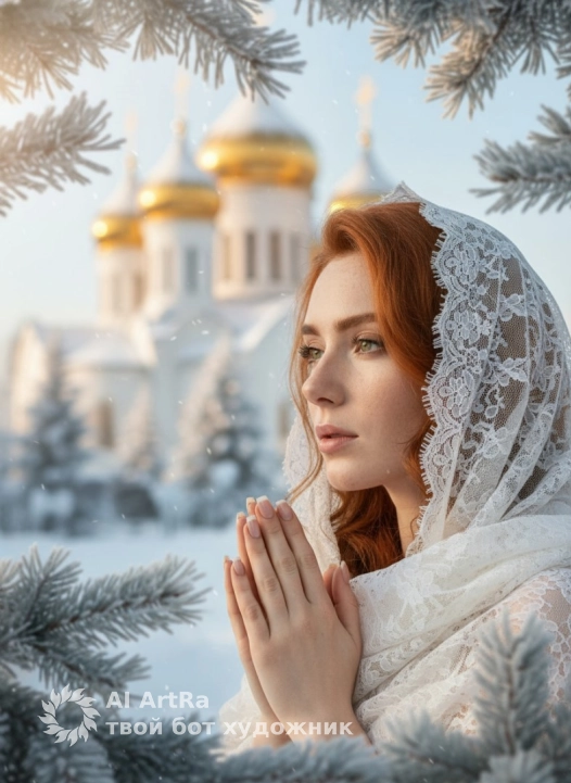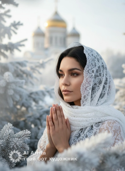 Создай портрет, не меняя черты лица. Фотопортрет крупным планом молодой женщины в полу профиль, ладони сложены вместе в молитвенном или мирном жесте. На ней изысканный белый полупрозрачный платок, покрывающий голову. Красивая женщина с безупречным макияжем, волосы волнистые . На заднем плане — размытый силуэт православного храма с золотыми куполами под заснеженными крышами. Зимнее утро, мягкий солнечный свет пробивается сквозь ветви ели, покрытые инеем. Высокая детализация кожи, текстуры кружева и снега. Атмосфера чистоты и духовности, гиперреализм, 8k.