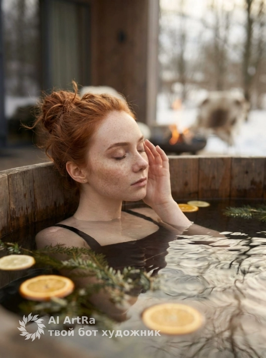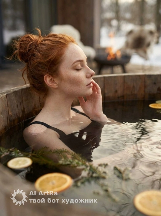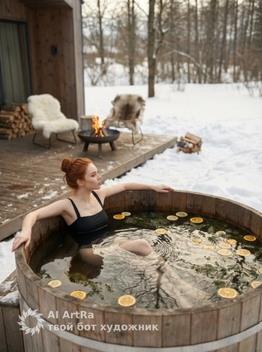 Не меняй черты лица Фотореалистичное изображение в чёрном цельном купальнике на брительках, полулежащая в деревянной уличной купели, опираясь локтем о край ванны, ракурс сбоку 3/4 с небольшого возвышения, мягкий рассеянный свет солнечного дня, на поверхности воды плавают кружочки цитрусовых и хвойные веточки, в воде видна легкая рябь и отражения деревьев, зима, на фоне панорамный дом с терассой на которой костровпя чаша с огнем, стулья деревянные с белыми и коричневыми шкурами, волосы собраны в небрежный пучок, пару прядей выпадает, теплые приглушённые природные тона, фотореализм, высокая детализация кожи, воды и текстур дерева, мягкое боке на заднем плане, кинематографическая цветокоррекция, объектив 50mm–85mm, низкая глубина резкости (f/1.8–f/2.8), ISO 200, дневной свет, 8k