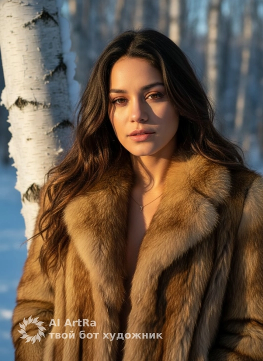 Гиперреалистичная, невероятно детализированная портретная фотография крупным планом: молодая девушка стоит в зимнем лесу у ствола белой берёзы, покрытой снегом. На ней роскошная золотисто-коричневая шуба из густого меха с золотистыми бликами, открытая на груди, с видимым тонким ожерельем. Выражение лица спокойное, задумчивое, взгляд прямо в камеру с лёгкой меланхолией. Драматическое золотое освещение закатного часа (golden hour), сильный боковой свет слева создаёт тёплые блики на коже, волосах и мехе, глубокие мягкие тени на правой стороне лица для объёма и контраста. Фон слегка размытый — снежный зимний лес с берёзами, холодные тона подчёркивают тепло света. Атмосфера мистическая, элегантная, кинематографическая, как высокая мода. Фотореализм 8K, идеальные текстуры волос, меха, кожи и снега, естественные блики и глубина резкости.