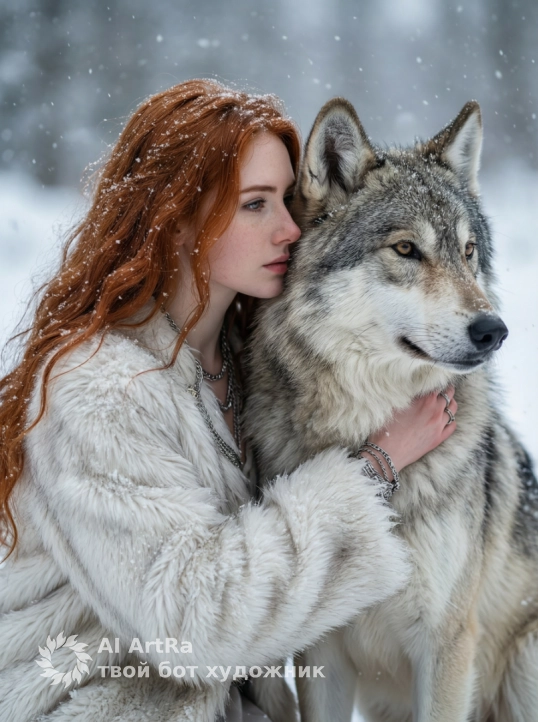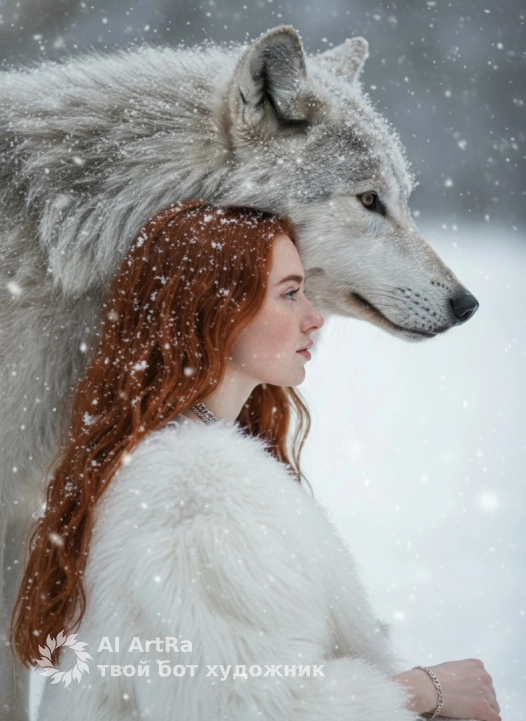 Не меняя внешности женщины с фото: молодая женщина стоит в профиль, немного повернута вправо, плотно прижимаясь к крупному волку. Волк с густой серо-беловатой шерстью занимает почти половину кадра, голова повернута вправо и чуть вперёд. Женщина одета в объемное белое меховое изделие с ворсистой фактурой, по которому мягко падают снежинки. Ее длинные волосы свободно падают волнами и укрыты мелкими снежинками. На шее и руке серебристые цепочки и браслеты. Мягкий, рассеянный свет создаёт приглушённые тени, подчеркивая меланхоличное и тёплое ощущение близости с природой. Фон — размытое снежное пространство со снежинками, усиливающее глубину и атмосферу. Контраст между хищной мудростью волка и нежностью женщины создаёт напряжённую, сказочную сцену. Атмосферное, фотореалистичное изображение с высокой текстурной детализацией, качеством и разрешением 4K.
