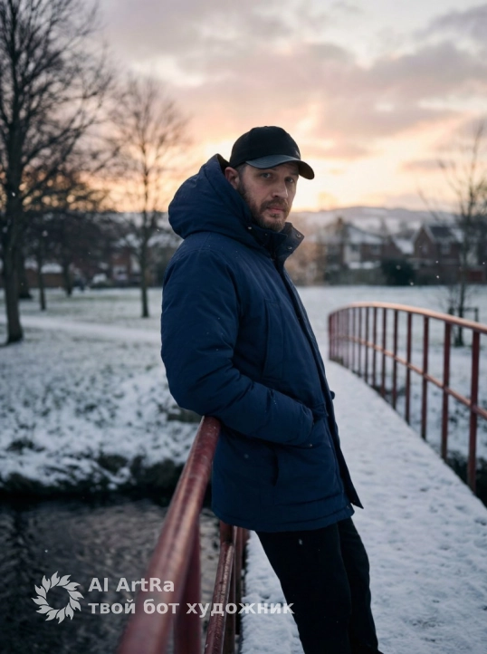 A man in winter clothing stands with his elbows resting on the bridge railing, stands sideways to the camera and looks into the camera. A relaxed, static pose. Medium shot. The composition features a slight shift of the figure to the right, with the camera eye at head level. He is wearing a voluminous dark blue hooded jacket, black pants, and a black cap with a curved visor. His hands are hidden in his sleeves. standing on a narrow pedestrian bridge with red metal railings, with a dark stream or small river below, a snow-covered park with bare trees without leaves around, softly blurred silhouettes of houses and hills in the background, a winter landscape with a thin layer of snow on the ground and railings, a sunset sky with soft pink-orange and gray clouds, soft diffused natural sunset light, the main lighting is from behind and from the side creating a subtle backlight on the edge of the hood and shoulders, faint soft shadows on the face and clothing, low contrast, a slight atmospheric smoky effect in the air and small snowflakes in the air, highly detailed, photorealistic, shot with an 85mm lens, medium depth of field with clear elaboration of the figure and soft bokeh of the background, muted cinematic photography style.